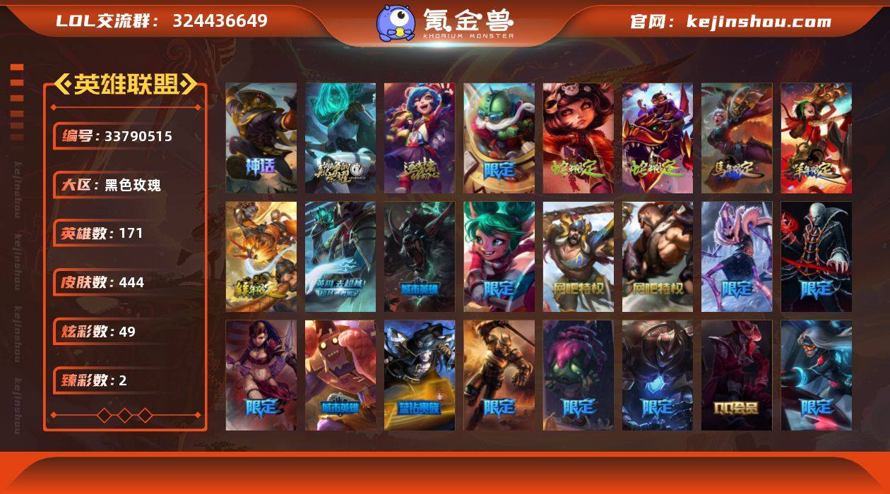 【LD5526】171英雄/444皮肤/3神话/89限定/2臻彩/49炫彩/37传说/110史诗/未定级/10周年 安妮/源代码 乐芙兰/新卧虎藏龙 贾克斯/无畏骑士 瑟庄妮 赤子初心/最终B0SS 维加 里·大魔王/龙年 孙悟空/“你看见过我的熊猫吗?” 安妮/神龙之翼 库奇/替父从军 花木兰/神龙烈焰 金克丝/美猴王 孙悟空/觅心猎手 薇恩/幸福女神 乐芙兰/圣诞开心鬼 提莫/圣诞精灵 崔丝塔娜/圣诞狂欢 努努/圣诞糖果棒 厄运小姐/“主人不要我了” 阿木木/胡桃夹子 小丑/平安夜女神 娑娜/英勇玩具兵船长/邪恶圣诞老人 维迦/夺命美人 卡特/冰雪节 茂凯/雪默丁格/圣诞玩偶 波比/圣诞老人 酒桶/圣诞驯鹿 克格莫/魄罗骑士 瑟庄妮/冰雪节 炼金/冰雪节 马尔扎哈/冰雪兽 纳尔/奥斯曼大帝 泰达米尔/生化领主 泰达米尔/巨角幻兽 阿利斯塔/卧虎藏龙 贾克斯/舞会公主安妮/诺斯费拉图 弗拉基米尔/地底世界 崔斯特/斩星魔剑 易/冠军典狱长 锤石/冠军之血 希瓦娜/冠军之矛 卡莉丝塔/S1FNC 酒桶/S1FNC 库奇/S2 暗杀星 蒙多/S2 暗杀星 努努/S2 暗杀星 慎/S3 SKT T1 贾克斯/S3 SKT T1 劫/S3 SKT T1 婕拉/S3 SKT T1 薇恩/S4 SSW 炼金/S4 SSW 图奇/S6 SKT T1 烬/2周年 德莱厄斯/3周年 厄运小姐/4周年 锐雯/胜利之树 茂凯/胜利枪神 格雷...
