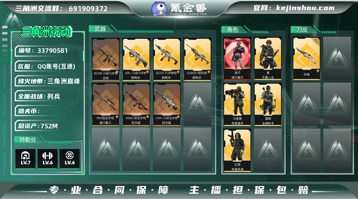 总资产:752.4M 5干员外观 1近战传说 26传说枪械 哈夫币:48.318K 不可二次 不可修改实名 251发aw子弹 【烽火地带段位】三角洲巅峰 【全面战场段位】列兵 【干员外观】蛊-不羁人生,乌鲁鲁-荒原猎手,骇爪-维什戴尔,红狼-电锯惊魂,露娜-金牌射手(S7) 【传说武器皮肤】近战-怜悯,MP7冲锋枪-电玩高手S2(典藏),SG552突击步枪-运动员,R93狙击步枪-维什戴尔,SCAR-H战斗步枪-启航,ASh-12战斗步枪-鹅鸭杀,QCQ171冲锋枪-鹅鸭杀,QJB201轻机枪-鹅鸭杀,G3战斗步枪-骑士,KC17突击步枪-电锯惊魂,SKS射手步枪-骑士,腾龙突击步枪-死神玫瑰,KC17突击步枪-点翠,PSG-1射手步枪-点翠,SG552突击步枪-点翠,M14射手步枪-缄花,腾龙突击步枪-马年祥瑞,M14射手步枪-蛮荒,QBZ95-1突击步枪-凌霄戍卫,G18-马年祥瑞,SR-25射手步枪-缄花,勇士冲锋枪-万金泪冠,腾龙突击步枪-万金泪冠,AWM狙击步枪-万金泪冠,.357左轮-缄花,M4A1突击步枪-阿米娅,CAR-15突击步枪-阿米娅