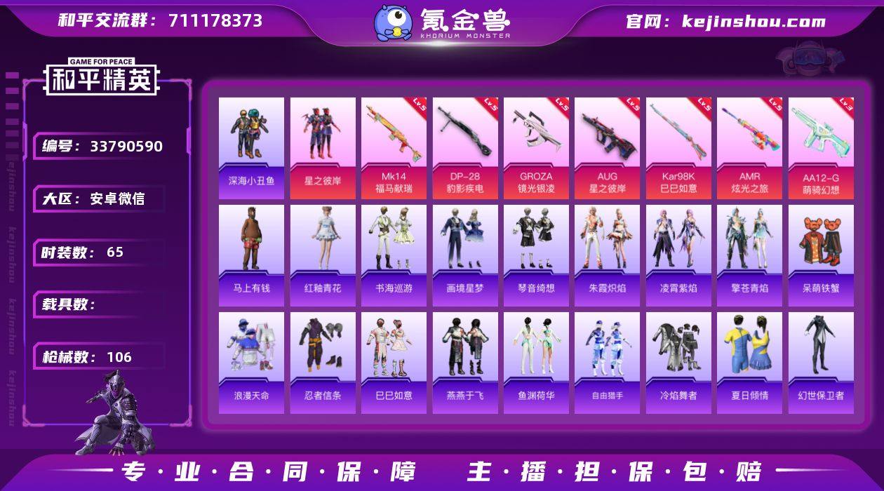 游戏30级 社交 1粉装 7特效枪 1印记【热门】浪漫天命 深海小丑鱼 忍者信条【粉装】星之彼岸【特效枪】GROZA镜光银凌 AUG星之彼岸 Kar98K巳巳如意 Mk14福马献瑞 AMR炫光之旅 AA12G萌骑幻想 DP28豹影疾电【飞行器】炫彩糖果飞行器【头盔】幻影战神头盔【背包】幻影战神背包 金羽特工背包