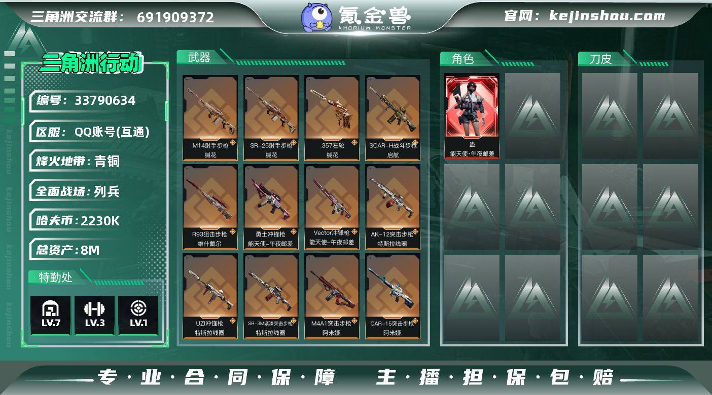 总资产:8.2M, 哈夫币:2230K ;总资产8M/哈夫币223万/战场等级9/行动等级40/安全箱等时效性道具以游戏内数据为准,详情请看图 蛊-能天使午夜邮差,近战-黑鹰,M4A1突击步枪-阿米娅,AK-12突击步枪-特斯拉线圈,SCAR-H战斗步枪-启航,CAR-15突击步枪-阿米娅,Vector冲锋枪-能天使-午夜邮差,UZI冲锋枪-特斯拉线圈,SR-3M紧凑突击步枪-特斯拉线圈,勇士冲锋枪-能天使-午夜邮差,M14射手步枪-缄花,SR-25射手步枪-缄花,R93狙击步枪-维什戴尔,.357左轮-缄花,AUG突击步枪-蝮蛇,SG552突击步枪-深海恐惧,SG552突击步枪-哈夫克警备,腾龙突击步枪-猎鳄行动,P90冲锋枪-紧急戒备,SMG-45冲锋枪-阿萨拉特攻,SR-3M紧凑突击步枪-战术竞备,M250通用机枪-囚徒,QJB201轻机枪-Old Habits,SV-98狙击步枪-林中猎手,M700狙击步枪-竞技风,野牛冲锋枪-黑潮,PSG-1射手步枪-极地勘察队,AK-12突击步枪-零点,SCAR-H战斗步枪-开心时刻,K437突击步枪-生存指令,MP5冲锋枪-弄臣,MP5冲锋枪-虎啸,MP5冲锋枪-哈夫克卫队,Vector冲锋枪-先锋,UZI冲锋枪-亚特兰蒂斯,勇士冲锋枪-冰天雪地,M1014霰弹枪-幻影结构,M249轻机枪-冰天雪地,QJB201轻机枪-哈夫克卫队,Mini-14射手步枪-荣耀列队,SKS射手步枪-弄臣,SR-25射手步枪-开拓,SR-25...