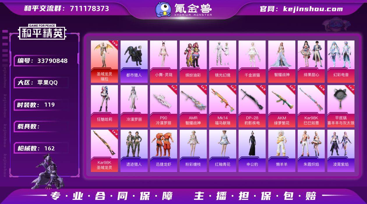 【961537】苹果【极品神装号 圣域龙灵-瑞拉(三级),粉装-缤纷油彩,套装-都市猎人,AKM-绿萝繁花(五级),P90-冷漠罗丽(七级)】 手Q-1神装-9粉装-8特效枪-0载具-3粉色飞行器-52907热力值-10王牌印记-119套装-162枪皮 【红色神装等级】:圣域龙灵-瑞拉(三级) 【红色角色神装】:圣域龙灵-瑞拉 【热门品类】:粉装-缤纷油彩,套装-都市猎人,套装-小丑鱼,套装-龟仙人,套装-软软马卡龙,套装-红熊茄茄 【粉色套装】:粉装-缤纷油彩,粉装-镜光幻境,角色-千金淑猫,角色-智耀战神,粉装-绯果甜心,粉装-幻彩电音,角色-狂魅哈莉,角色-冷漠罗丽,人物-小舞·灵珑 【粉色枪皮等级】:AKM-绿萝繁花(五级),P90-冷漠罗丽(七级),Kar98K-巳巳如意(五级),Kar98K-圣域龙灵(三级),Mk14-福马献瑞(五级),AMR-智耀战神(七级),DP-28-豹影疾电(五级),平底锅-喜羊羊与灰太狼(三级) 【粉色枪皮】:AKM-绿萝繁花,P90-冷漠罗丽,Kar98K-巳巳如意,Kar98K-圣域龙灵,Mk14-福马献瑞,AMR-智耀战神,DP-28-豹影疾电,平底锅-喜羊羊与灰太狼 【粉色飞行器】:圣域金龙飞行器,绯果甜心飞行器,云梦轻舟飞行器 【粉色降落伞】:萌物绒绒降落伞,炫光之旅降落伞,临安公主降落伞,圣域龙灵降落伞...