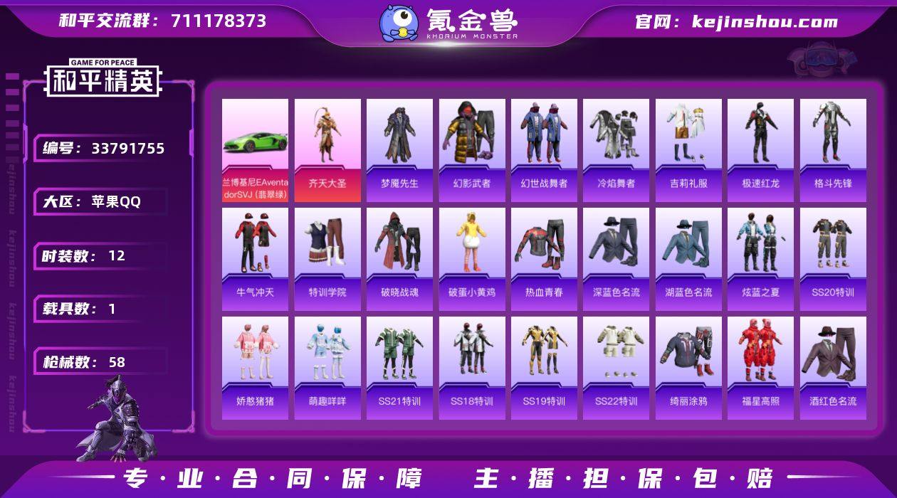 HX9619【兰博基尼Aventador SVJ-粉装-齐天大圣-角色-猎影月神-身法素材号】苹果 手Q-1粉装-0特效枪-1载具-0粉色飞行器-17454热力值-3王牌印记-52套装-58枪皮 【粉色套装】:粉装-齐天大圣 【粉色载具】:兰博基尼Aventador SVJ(翡翠绿) 【粉色降落伞】:林间仙鹿降落伞,闪光银龙降落伞 【稀有套装】:套装-蓝冰羽,角色-猎影月神 【稀有枪皮】:AKM-彩虹符号,AKM-虎虎生威,M16A4-幻世战舞者,SCAR-L-炫彩节奏,SCAR-L-玉兔迎春苹果Q区-1粉装-17454热力值-3王牌印记-52套装-58枪皮【优质套装】: 齐天大圣【优质载具皮肤】 兰博基尼Aventador SVJ(翡翠绿)【稀有武器皮肤】: PKM-紫幽梦 Mk14-紫幽梦 蜜獾-乌木金纹 S1897-紫幽梦 P92-紫幽梦 M416-红色方程式 AKM-彩虹符号 AKM-虎虎生威 SCAR-L-红色方程式 SCAR-L-玉兔迎春 SCAR-L-炫彩节奏 M16A4-幻世战舞者 AUG-耀粉歌者 M762-瑞龙福将 M762-奇异狩猎者 Mk47-乌木金纹 G36C-乌木金纹 G36C-暗夜玫瑰 AC-VAL-天降萌叽 蜜獾-垂柳戏鸭 蜜獾-娇憨猪猪 M24-乌木金纹 Win94-瑞龙福将 AMR-乌木金纹 VSS-碧影闪光 Mini14-耀粉歌者 Mini14-炫彩节奏 Mk14-乌木金纹 SLR-娇憨猪猪 UZI-炫彩节奏 UZI-红色方程式 UZI-娇憨猪猪 UZI-天降...