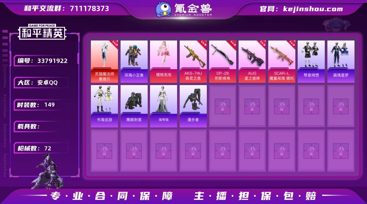 【特价出售】钱包无法注销安卓Q-1红装2粉装7特效枪4热门38套装72枪皮 24196热力值 4印记 历史超级王牌13星 【1红装】 灵猫魔法师-塞维尔 (2级) 【2粉装】 月中灵 樱桃泡泡 【7特效枪】 SCAR-L-魔童闹海哪吒 (3级) M416-灵猫魔法师 (3级) AKS-74U-森灵之息 (5级) DP-28-豹影疾电 (5级) AUG-星之彼岸 (5级) AA12-G-萌骑幻想 (2级) UMP45-萌骑冒险 (3级) 【4热门】 鹰眼刺客 深海小丑鱼 漫步者 破蛋小黄鸡