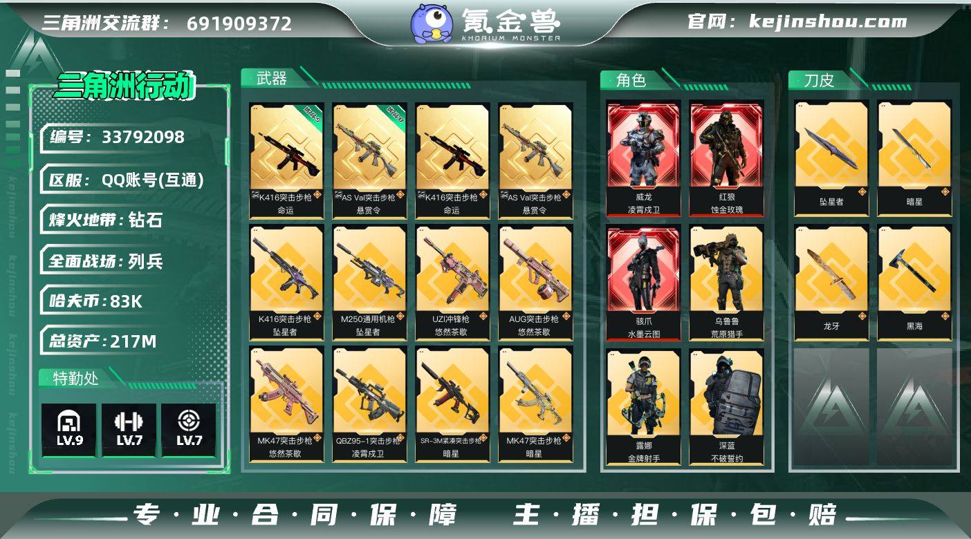 【961572】217m总资产-83k哈夫币-60烽火等级-钻石-39战场等级-列兵 【干员外观】:红狼-蚀金玫瑰,骇爪-水墨云图,威龙-凌霄戍卫,威龙-壮志凌云,蜂医-送葬人·无题密令,无名-夜鹰,深蓝-不破誓约,露娜-金牌射手,乌鲁鲁-荒原猎手 【近战皮肤】:近战-坠星者,近战-暗星,近战-黑海,近战-龙牙,近战-处刑者2级,近战-黑鹰 【典藏外观】:K416突击步枪-命运,AS Val突击步枪-悬赏令 【典藏外观成色】:K416突击步枪-命运(优品S),AS Val突击步枪-悬赏令(优品B) 【传说外观】:M4A1突击步枪-蚀金玫瑰,M4A1突击步枪-阿米娅,AKM突击步枪-锦绣,QBZ95-1突击步枪-凌霄戍卫,K416突击步枪-坠星者,AUG突击步枪-悠然茶歇,AUG突击步枪-西装暴徒,M7战斗步枪-神秘艺术,SG552突击步枪-运动员,AK-12突击步枪-夜鹰,AK-12突击步枪-特斯拉线圈,SCAR-H战斗步枪-铁艺苍穹,SCAR-H战斗步枪-水墨云图,SCAR-H战斗步枪-启航,CAR-15突击步枪-黑鹰坠落,CAR-15突击步枪-阿米娅,腾龙突击步枪-捞点薯条,腾龙突击步枪-万金泪冠,K437突击步枪-锦绣,MK47突击步枪-悠然茶歇,MK47突击步枪-暗星,MP5冲锋枪-黑海,UZI冲锋枪-特斯拉线圈,UZI冲锋枪-悠然茶歇,SMG-45冲锋枪-骑士,SMG-45冲锋...
