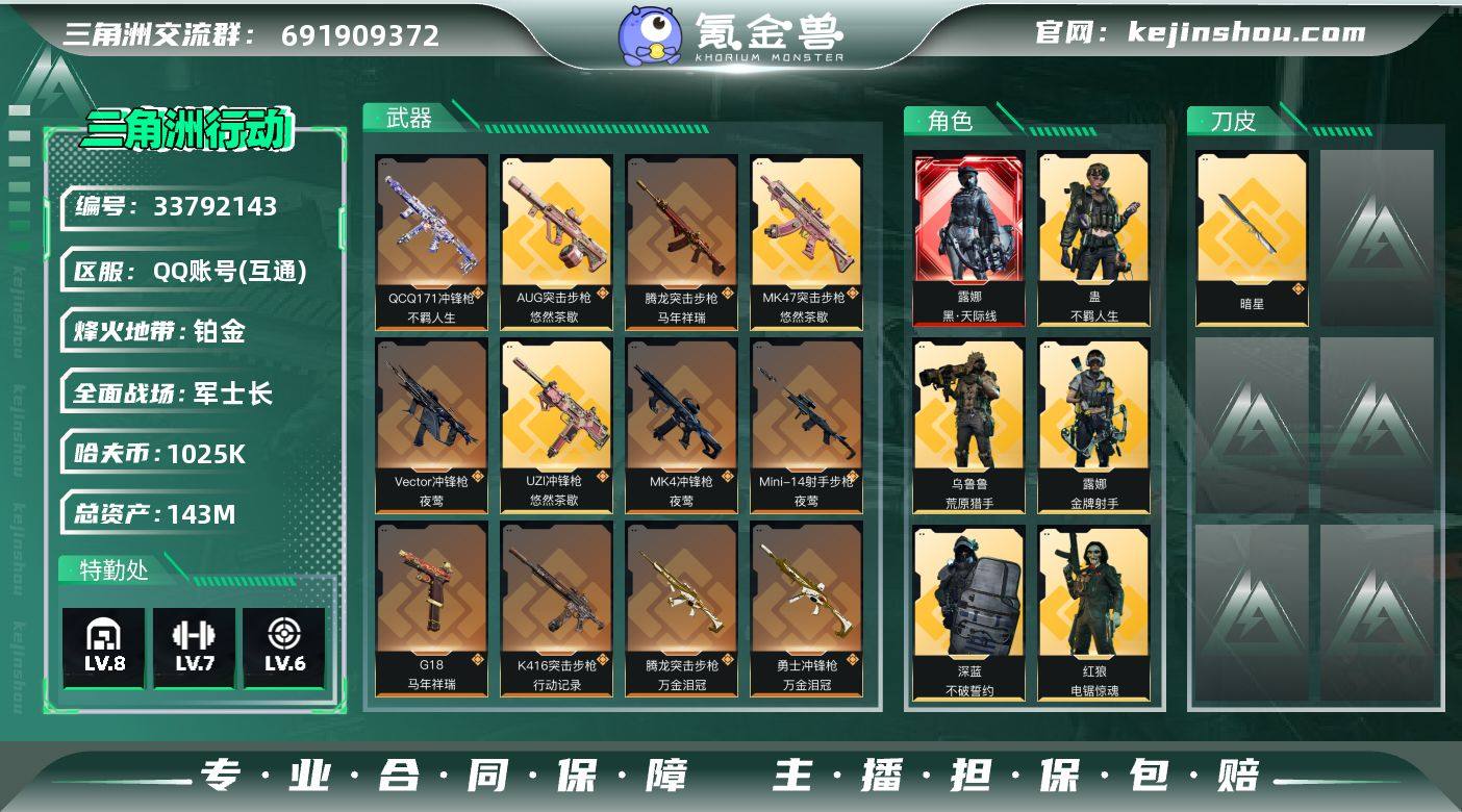 【961567】143m总资产-1025k哈夫币-60烽火等级-铂金-50战场等级-军士长 【干员外观】:露娜-黑·天际线,威龙-壮志凌云,蜂医-送葬人·无题密令,无名-夜鹰,深蓝-不破誓约,红狼-电锯惊魂,露娜-金牌射手,乌鲁鲁-荒原猎手,蛊-不羁人生 【近战皮肤】:近战-暗星,近战-黑鹰 【传说外观】:M4A1突击步枪-阿米娅,ASh-12战斗步枪-鹅鸭杀,K416突击步枪-行动记录,AUG突击步枪-悠然茶歇,SG552突击步枪-运动员,AK-12突击步枪-夜鹰,AK-12突击步枪-特斯拉线圈,SCAR-H战斗步枪-铁艺苍穹,SCAR-H战斗步枪-启航,G3战斗步枪-骑士,CAR-15突击步枪-阿米娅,腾龙突击步枪-捞点薯条,腾龙突击步枪-马年祥瑞,腾龙突击步枪-万金泪冠,KC17突击步枪-电锯惊魂,MK47突击步枪-悠然茶歇,MK47突击步枪-暗星,Vector冲锋枪-夜莺,UZI冲锋枪-特斯拉线圈,UZI冲锋枪-悠然茶歇,SMG-45冲锋枪-骑士,SR-3M紧凑突击步枪-特斯拉线圈,SR-3M紧凑突击步枪-暗星,勇士冲锋枪-能天使-午夜邮差,勇士冲锋枪-万金泪冠,QCQ171冲锋枪-鹅鸭杀,QCQ171冲锋枪-不羁人生,MK4冲锋枪-夜莺,725双管霰弹枪-送葬人-无题密令,M250通用机枪-骑士之心,QJB201轻机枪-鹅鸭杀,Mini-14射手步枪-夜莺,M14射手步枪-蛮...