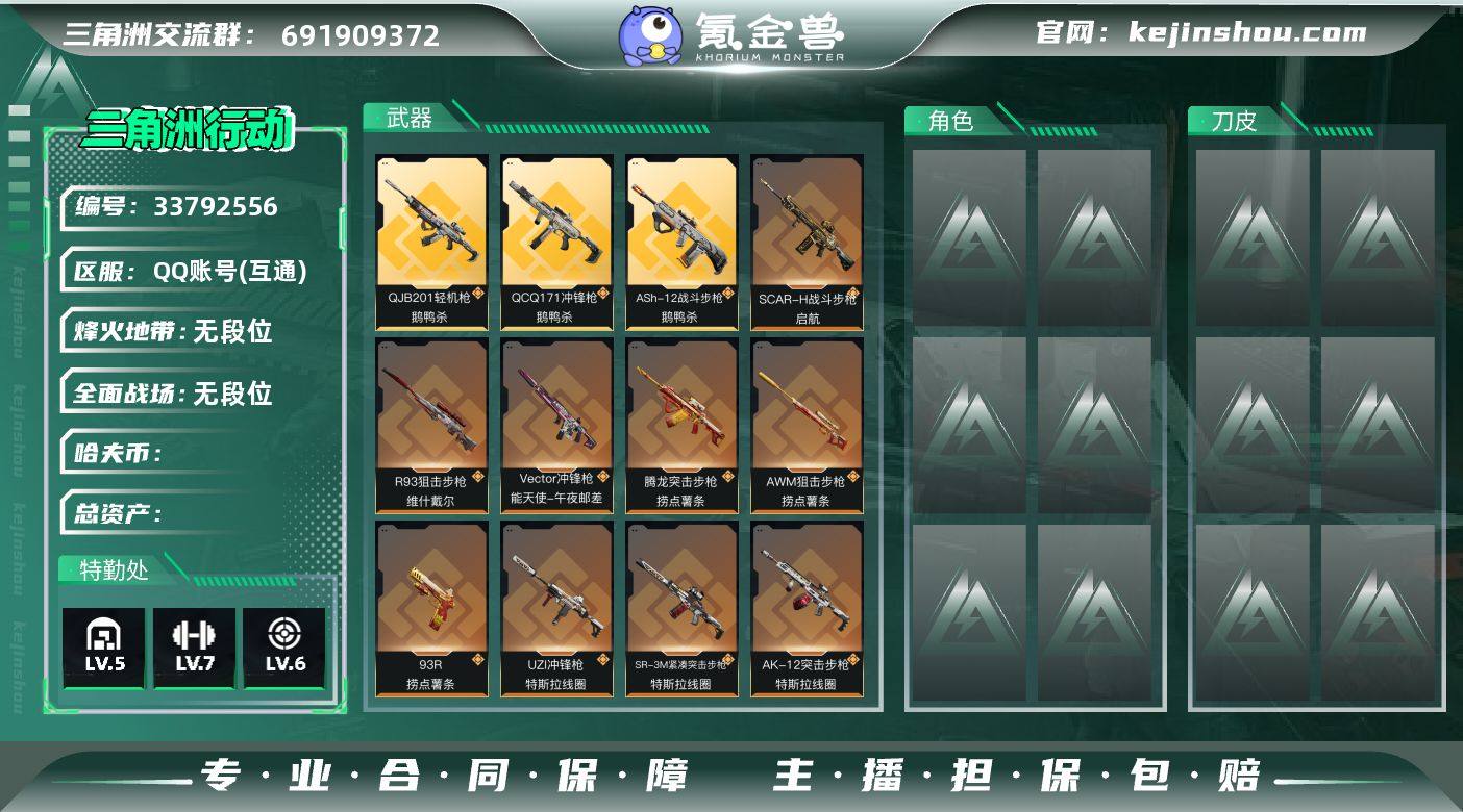 19传说枪械 哈夫币:4.927K 不可二次 不可修改实名 【烽火地带段位】无段位 【全面战场段位】无段位 【传说武器皮肤】KC17突击步枪-电锯惊魂,UZI冲锋枪-特斯拉线圈,勇士冲锋枪-能天使-午夜邮差,Vector冲锋枪-能天使-午夜邮差,R93狙击步枪-维什戴尔,SCAR-H战斗步枪-启航,ASh-12战斗步枪-鹅鸭杀,QCQ171冲锋枪-鹅鸭杀,QJB201轻机枪-鹅鸭杀,勇士冲锋枪-万金泪冠,腾龙突击步枪-万金泪冠,AWM狙击步枪-万金泪冠,AK-12突击步枪-特斯拉线圈,SR-3M紧凑突击步枪-特斯拉线圈,93R-捞点薯条,腾龙突击步枪-捞点薯条,M4A1突击步枪-阿米娅,CAR-15突击步枪-阿米娅,AWM狙击步枪-捞点薯条