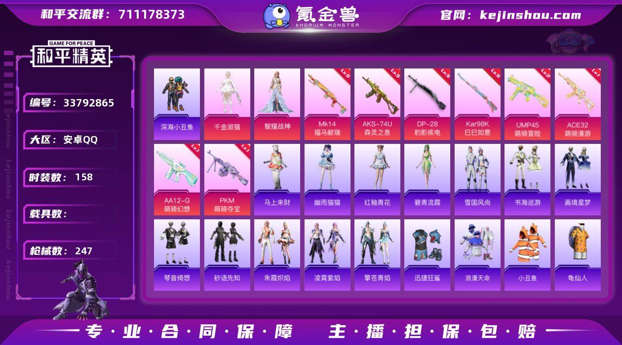【LHPX1404】【特价出售/店主推荐】安卓 手Q-2粉装-8特效枪-0载具-3粉色飞行器-73929热力值-19王牌印记-158套装-247枪皮 【热门品类】:套装-浪漫天命,套装-深海小丑鱼,套装-小丑鱼,套装-龟仙人,套装-粉红小猪 【粉色套装】:角色-千金淑猫,角色-智耀战神 【粉色枪皮等级】:ACE32-萌骑漫游(一级),UMP45-萌骑冒险(二级),AKS-74U-森灵之息(五级),Kar98K-巳巳如意(五级),Mk14-福马献瑞(五级),AA12-G-萌骑幻想(一级),DP-28-豹影疾电(五级),PKM-萌骑夺宝(一级) 【粉色枪皮】:ACE32-萌骑漫游,UMP45-萌骑冒险,AKS-74U-森灵之息,Kar98K-巳巳如意,Mk14-福马献瑞,AA12-G-萌骑幻想,DP-28-豹影疾电,PKM-萌骑夺宝 【粉色飞行器】:炫彩糖果飞行器,歌者泠鸢飞行器,极意拳锋飞行器 【粉色降落伞】:烈焰拳霸降落伞,太空嘟嘟降落伞,彩虹甜喵降落伞,音爆索尼克降落伞,精灵梦叶罗丽降落伞,守护天翼降落伞,千金淑猫降落伞,樱桃泡泡降落伞,星穹咏叹调降落伞,炫彩糖果降落伞 【稀有套装】:套装-龟仙人,套装-巳巳如意,套装-雪国风尚,套装-炫彩糖果,套装-砂语先知,套装-马上来财,套装-糖糖葫芦,套装-青团波波,套装-燕燕于飞,套装-鱼渊荷华,套装-粉恋花,...