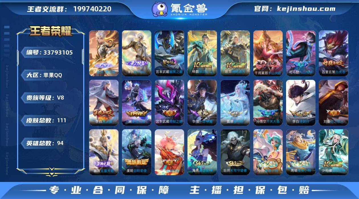 可换绑【高质量精品号·李白瑶无双·九山相柳·齐天大圣·白虎志·凤求凰】 幸运值302 20按键,2星传说,4王者印记,五级铭文60,无二次,苹果Q-V8-111皮肤-2无双-16传说-36史诗【英雄全皮】:司马懿全皮【无双皮肤】:曜器灵螭龙剑,李白碎月剑心【星元皮肤】:宫本武藏幽冥之眼,庄周牧野星辉【传说皮肤】:杨戬纵目迁山,后羿神树通天,干将莫邪千山共赴,司马懿九山相柳,嬴政玄雷天君,庄周牧神诗旅,澜逐花归海,露娜霜月吟,孙悟空齐天大圣,李白诗剑行,虞姬启明星使,李信一念神魔,刘备时之恋人,百里玄策白虎志,李白凤求凰,宫本武藏地狱之眼【限定皮肤】:狄仁杰阴阳师,赵云皇家上将,狄仁杰魔术师,项羽海滩派对,孙悟空齐天大圣,虞姬启明星使,雅典娜单词大作战,百里玄策白虎志,李白碎月剑心,伽罗琥珀纪元【年限皮肤】:李白凤求凰,百里玄策白虎志【赛季限定】:钟馗虚灵犬护,甄姬逆浪荇歌,亚瑟荣光之誓【战令限定】:雅典娜单词大作战,刘禅鸭鸭历险记,沈梦溪鸭鸭历险记,周瑜百相守梦,孙策百相守梦,兰陵王傩神司,莱西奥光弋星穹,明世隐往忆晖光,周瑜线条小狗,小乔线条小狗【史诗皮肤】:后羿天穹守望者,海月海之女神,周瑜线条小狗,小乔线条小狗...