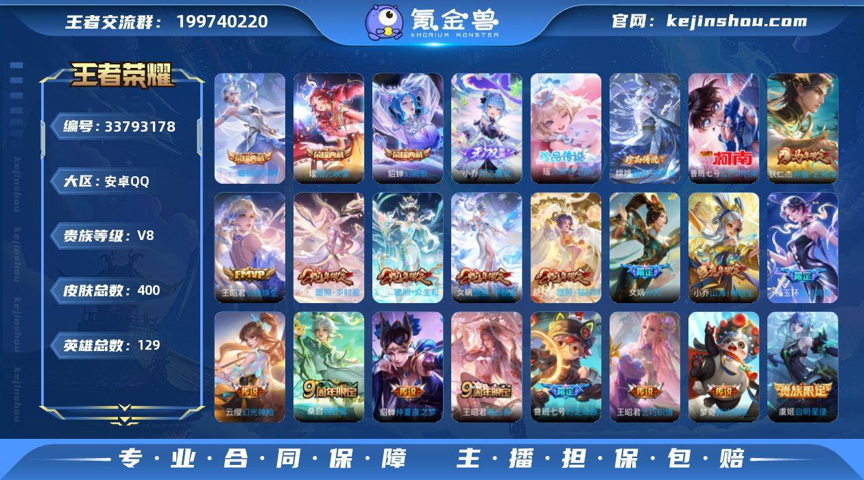 【王者荣耀】珍品无双0 典藏3 无双1 珍品传说3 传说20 史诗119 英雄129 皮肤400 贵族8级 荣耀典藏:幻阙歌|拾光映像|最初的交响__无双皮肤:时之魔女__珍品传说:江户川柯南|器灵·落星盏|大耳狗之梦__传说皮肤:鸣野蒿|补天|启明星使|胖达荣荣|仲夏夜之梦|乞巧织情|鲁班七号-时之奇旅|山海·琳琅生|朵莉亚-心动手记|灼幽烈阳|映山客|牧神诗旅|幻光神枪|愿照·岁时盈|愿照·众生和|愿照·福禄聚|星之鸣奏|愿照·千秋盛|长夜焕生|神骥·赴朔漠__稀有限定:白晶晶|朱雀志|蔷薇恋人|猪悟能|李小龙|梁祝|山海·碧波行|时之彼端|狮舞东方|唐三藏|拒霜思|暗影游猎|百里守约-真我赫兹|嫦娥-如梦令|妲己-时之奇旅|大漠名商|地狱燃心|繁星吟游|高山流水|古海寻踪|海滩派对|海盐诗旅|航海奇遇记|胡桃异想国|皇家上将|混沌棋|剑破天穹|江河有灵|金庭之子|狂想玩偶喵|黎明之约|迷踪丽影|魔法小厨娘|魔术师|奇幻香踪|千军破阵|擒涛扼浪|穷奇|驱傩正仪|燃音魔法|热情桑巴|荣光圣徽|沙漠行僧|朔风刀|探海日志|饕餮|醍醐杖|天穹祈灯|玩趣恶龙|万华元夜|无心|五谷丰年|纤云弄巧|星空之诺|驯魔猎人|演武夺筹|夜都怪侠|疑决卦|阴阳师|吟游魔法|银河之约|游园惊梦|遇见飞天|御旌|御銮|御狮|云间偶戏|真爱魔法|逐...