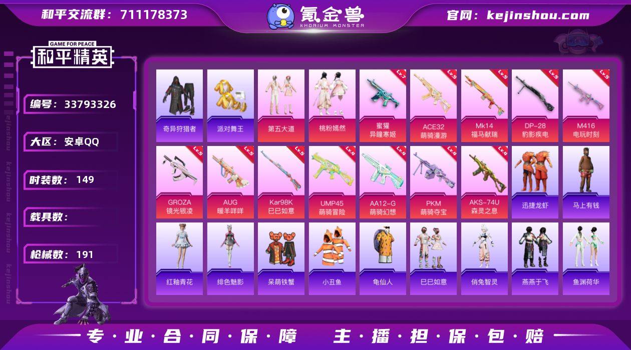 【LHPX2495】【特价出售/店主推荐/21印记战神小号第五大道金鞋小丑鱼满级蜜獾精品公主号】安卓 手Q-无敌战神框-2粉装-12特效枪-0载具-3粉色飞行器-56042热力值-21王牌印记-149套装-191枪皮 【热门品类】:套装-派对舞王,套装-小丑鱼,套装-奇异狩猎者,套装-龟仙人 【粉色套装】:粉装-第五大道,粉装-桃粉嫣然 【粉色枪皮等级】:M416-电玩时刻(五级),GROZA-镜光银凌(五级),AUG-暖羊咩咩(五级),蜜獾-异瞳寒姬(七级),ACE32-萌骑漫游(五级),UMP45-萌骑冒险(四级),AKS-74U-森灵之息(四级),Kar98K-巳巳如意(五级),Mk14-福马献瑞(五级),AA12-G-萌骑幻想(四级),DP-28-豹影疾电(五级),PKM-萌骑夺宝(四级) 【粉色枪皮】:M416-电玩时刻,GROZA-镜光银凌,AUG-暖羊咩咩,蜜獾-异瞳寒姬,ACE32-萌骑漫游,UMP45-萌骑冒险,AKS-74U-森灵之息,Kar98K-巳巳如意,Mk14-福马献瑞,AA12-G-萌骑幻想,DP-28-豹影疾电,PKM-萌骑夺宝 【粉色飞行器】:炫彩糖果飞行器,闪光银龙飞行器,辉光之愿飞行器 【粉色降落伞】:风花雪月降落伞,暗夜鎏金降落伞,精灵梦叶罗丽降落伞,星梦奇缘降落伞,忍者神龟降落伞,月影灵韵降落伞,异瞳寒姬降落伞,炫彩糖果降落伞 【稀有套装】:套装-...