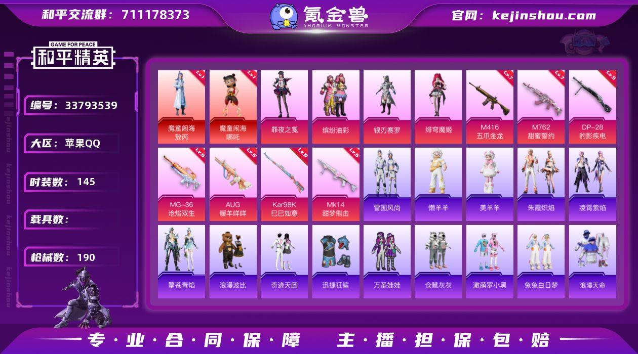 【AZH2420】苹果 手Q【一级敖丙 一级哪吒 猪脸红熊茄茄软软马卡龙兔兔白日梦 满级五爪金龙M416 满级甜蜜誓约M762】2神装-4粉装-7特效枪-0载具-3粉色飞行器-61915热力值-13王牌印记-145套装-190枪皮 【红色神装等级】:魔童闹海-敖丙(一级),魔童闹海-哪吒(一级) 【红色角色神装】:魔童闹海-敖丙,魔童闹海-哪吒 【热门品类】:粉装-缤纷油彩,套装-浪漫天命,套装-浪漫波比,套装-软软马卡龙,套装-红熊茄茄 【粉色套装】:粉装-缤纷油彩,粉装-银刃赛罗,角色-绯穹魔姬,角色-罪夜之冕 【粉色枪皮等级】:M416-五爪金龙(七级),AUG-暖羊咩咩(五级),M762-甜蜜誓约(七级),Kar98K-巳巳如意(五级),Mk14-甜梦熊击(五级),DP-28-豹影疾电(五级),MG-36-沧焰双生(五级) 【粉色枪皮】:M416-五爪金龙,AUG-暖羊咩咩,M762-甜蜜誓约,Kar98K-巳巳如意,Mk14-甜梦熊击,DP-28-豹影疾电,MG-36-沧焰双生 【粉色飞行器】:飞天猪飞行器,灵珠游龙飞行器 【粉色降落伞】:快乐主宰降落伞,童趣迷兔降落伞,千金淑猫降落伞,月下星之子降落伞,桃粉嫣然降落伞,戏水时光降落伞,喜羊羊与灰太狼降落伞,魔童闹海 哪吒降落伞,炫彩糖果降落伞 【稀有套装】:套装-巳巳如意,套装-小鸟芋圆...