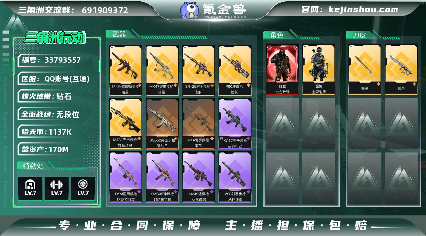 QQY338/包人脸/QQ区【2刀1红】【总资产:170M+近战-暗星+近战-信条+红狼-蚀金玫瑰+露娜-金牌射手+六套仓库大红多多+40发AWM子弹+】/烽火等级:60级/全面战场:5/纯币:1137K三角券加币:58(三角币58+三角券0)【2刀1红+缄花捆绑包】//部门:33233/特勤等级(技术中心满级/工作台满级/制药台满级/防具台满级/仓库7级/指挥中心6级/训练中心7级/靶场7级/潜水中心2级/收藏室1级)---缄花捆绑包/M4A1突击步枪-蚀金玫瑰/腾龙突击步枪-马年祥瑞/P90冲锋枪-信条/AKM突击步枪-锦绣/K416突击步枪-行动记录/SR-3M紧凑突击步枪-暗星---/橙色挂饰6/(流动资产:126.8M)段位:钻石II/详细看图