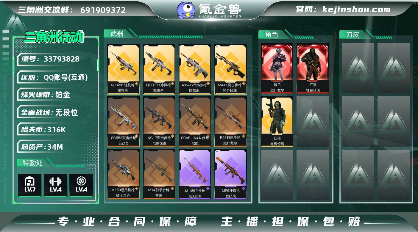 【AZS287】34m总资产-316k哈伏币-60烽火等级-铂金-5战场等级-无军衔 【干员外观】:红狼-蚀金玫瑰,骇爪-维什戴尔,红狼-电锯惊魂 【近战皮肤】:近战-黑鹰 【传说外观】:M4A1突击步枪-蚀金玫瑰,ASh-12战斗步枪-鹅鸭杀,SG552突击步枪-运动员,SCAR-H战斗步枪-启航,KC17突击步枪-电锯惊魂,QCQ171冲锋枪-鹅鸭杀,M250通用机枪-骑士之心,QJB201轻机枪-鹅鸭杀,M14射手步枪-蛮荒,R93狙击步枪-维什戴尔 【史诗外观】:ASh-12战斗步枪-无极限,G3战斗步枪-流沙送葬,AS Val突击步枪-百步穿杨,腾龙突击步枪-猎鳄行动,K437突击步枪-守护者,MP5冲锋枪-战术竞备,MP5冲锋枪-竞技风,SR-3M紧凑突击步枪-战术竞备,勇士冲锋枪-工业狂潮,MP7冲锋枪-守护者,Mini-14射手步枪-守护者, M14射手步枪-航天庆典,AWM狙击步枪-无极限,复合弓-守护者 【稀有外观】:AS Val突击步枪-地平线,AKM突击步枪-战术演练,AKM突击步枪-肃杀,QBZ95-1突击步枪-公平竞技,M7战斗步枪-捣蛋鬼,AK-12突击步枪-烈焰狂潮,SCAR-H战斗步枪-荣耀列队,SCAR-H战斗步枪-黄昏,G3战斗步枪-战术演练,G3战斗步枪-主宰*2,MP5冲锋枪-弄臣,MP5冲锋枪-哈夫克卫队,P90冲锋枪-黄昏,P90冲锋枪-捣蛋鬼,Vector...