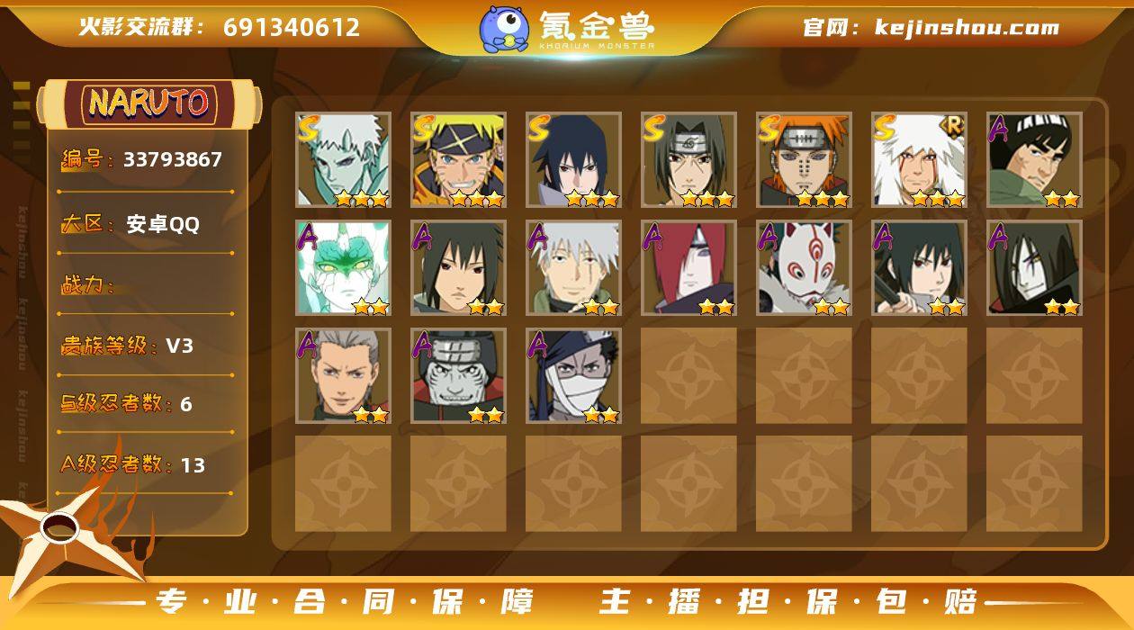 【HYX3766】VIP等级V3/S忍数量6/A忍数量13/三星S-自来也「舞之豪杰」/三星S-宇智波带土「十尾人柱力」/三星S-宇智波佐助「永恒万花筒」/二星A-长门「青年」/二星A-桃地再不斩/2星小南「神驹佑将」/三星S-佩恩「天道」/二星A-飞段/三星S-漩涡鸣人·宇智波佐助/二星A-宇智波泉奈/二星A-旗木卡卡西 「幻之真容」/二星A-巳月「仙人模式」/二星A-干柿鬼鲛/二星A-迈特凯「青春爆炸」/二星A-宇智波佐助「须佐能乎」/二星A-神秘面具男 「忍者之路」/2星旗木卡卡西「神威对决」/二星A-大蛇丸「晓」/三星S-宇智波鼬 「须佐能乎」