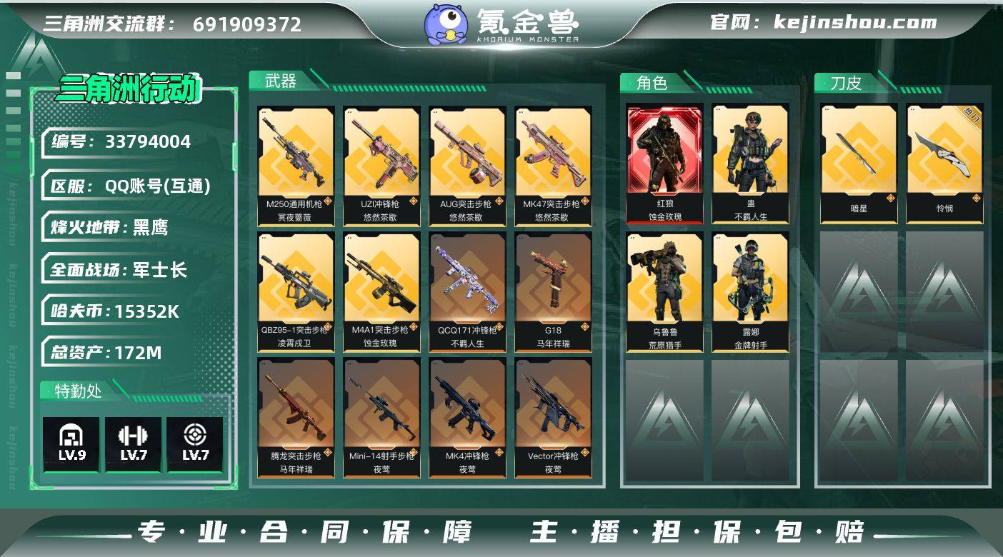 【PTSJZ4677】总资产172M/哈夫币1535万/传说近战数1/传说枪皮数22/战场等级25/行动等级60/安全箱等时效性道具以游戏内数据为准,详情请看图/红狼-蚀金玫瑰/露娜-金牌射手(S7)/乌鲁鲁-荒原猎手/蛊-不羁人生/近战-暗星/近战-怜悯/近战-黑鹰/M4A1突击步枪-蚀金玫瑰/AKM突击步枪-锦绣/QBZ95-1突击步枪-凌霄戍卫/AUG突击步枪-悠然茶歇/SG552突击步枪-运动员/腾龙突击步枪-马年祥瑞/腾龙突击步枪-万金泪冠/K437突击步枪-锦绣/KC17突击步枪-电锯惊魂/MK47突击步枪-悠然茶歇/Vector冲锋枪-夜莺/UZI冲锋枪-悠然茶歇/SMG-45冲锋枪-锦绣/勇士冲锋枪-万金泪冠/QCQ171冲锋枪-不羁人生/MK4冲锋枪-夜莺/M250通用机枪-冥夜蔷薇/Mini-14射手步枪-夜莺/M14射手步枪-蛮荒/SKS射手步枪-骑士/AWM狙击步枪-万金泪冠/G18-马年祥瑞/勇士冲锋枪-檀劫铳影/K416突击步枪-冬日风情/K416突击步枪-腊梅/K416突击步枪-阿萨拉特攻/AUG突击步枪-蝮蛇/M7战斗步枪-百步穿杨/SG552突击步枪-深海恐惧/SG552突击步枪-哈夫克警备/SCAR-H战斗步枪-囚徒/G3战斗步枪-流沙送葬/AS Val突击步枪-百步穿杨/腾龙突击步枪-猎鳄行动/K437突击步枪-丛林谍踪/MP5冲锋枪-竞技风/Vector冲锋枪-百步穿杨/Vector冲锋枪-异域战争/SR-3M...