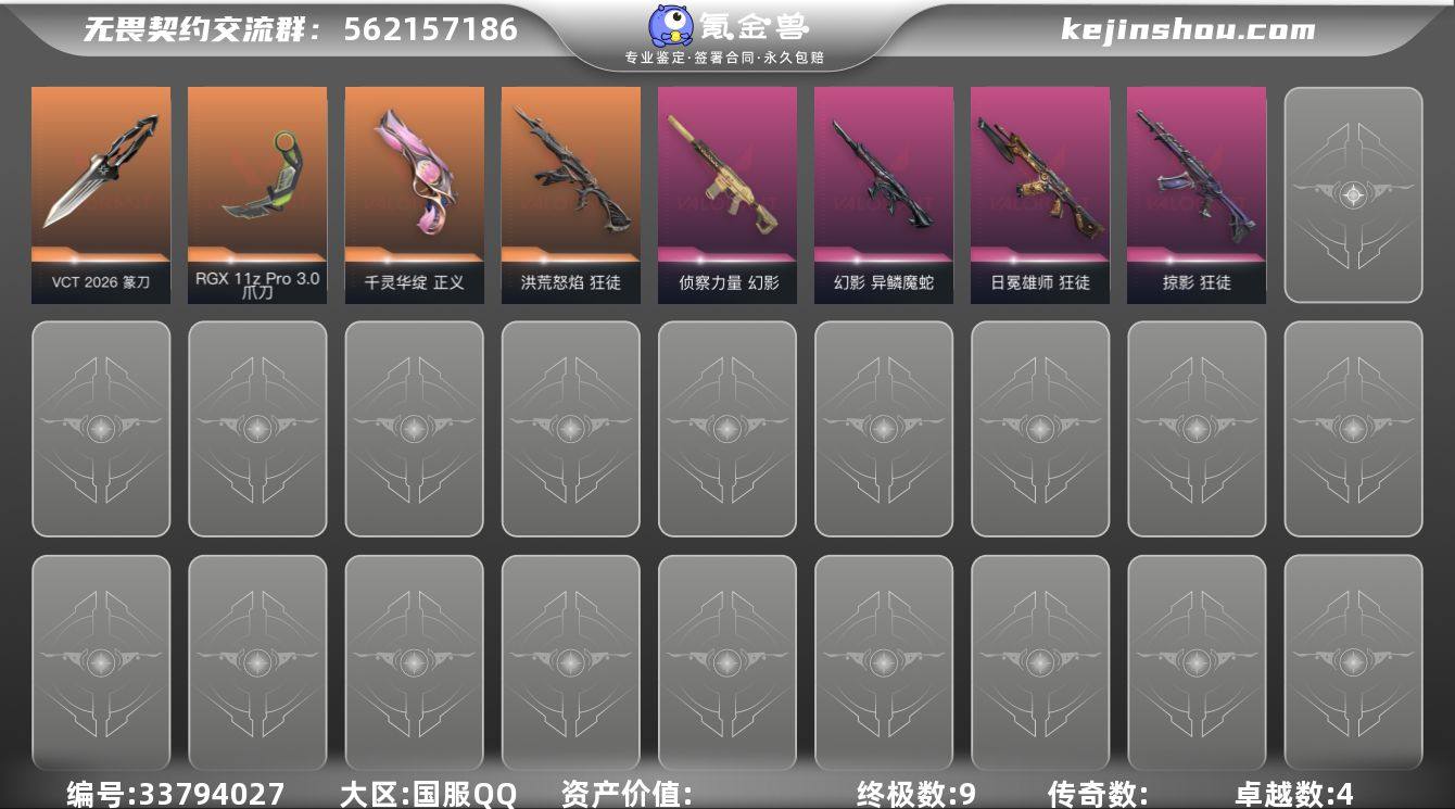 【WWD553】LV等级60/皮肤总价值23250/段位黄金/总皮肤数量36/刀皮数量6/枪皮数量30/套装数量1/具体详情请看图/VCT 2026 赛季套装/幻棱/炼狱/维斯/暮蝶/壹决/铁臂/捷风/幽影/不死鸟/贤者/猎枭/蝰蛇/芮娜/奇乐/尚勃勒/霓虹/斯凯/盖可/黑梦/钢锁/近战武器-蒙太奇 战斧/近战武器-荆刺链刃/VCT 2026 篆刀/魔术火花/爪刀-RGX 11z Pro 3.0/狂徒-洪荒怒焰/狂徒-荆刺圣骸/狂徒-掠影/狂徒-日冕雄师/幻影-侦察力量/幻影-异鳞魔蛇/幻影-蒙太奇/战神-蒙太奇/骇灵-蒙太奇/正义-千灵华绽/狂怒-蒙太奇/Clutch 卡面/无畏契约GO!第一卷:零 卡面/《双城之战》金克丝 卡面/钢锁vs盖可 卡面/代号红色 卡面/新兵报到 卡面/V契约 卡面/无畏契约 卡面/霓光四射 喷漆/买装还是存钱 喷漆/关门放狗 喷漆/无畏契约GO!第一卷:贤者 喷漆/放下武器 喷漆/胜利属于无畏契约 喷漆/GLHF 喷漆/无畏契约 喷漆/无畏契约GO!第一卷 零 挂饰/天外飞客 挂饰/无畏契约 纪念币 挂饰