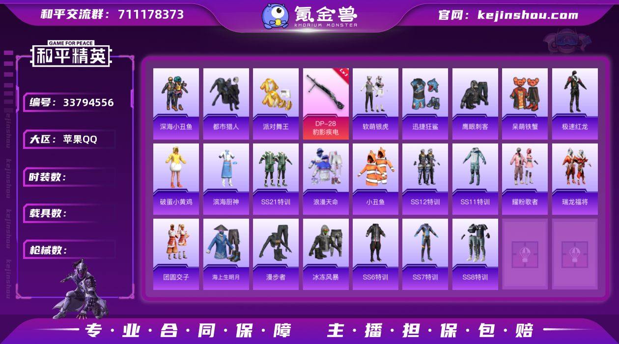 DSH2452【4特 深海小丑鱼 浪漫天命 暗影哥特 都市猎人 金鞋子 小丑鱼 】苹果手Q-4特效枪-144套装-150枪皮-6王牌印记-超级王牌9星-41218热力值【4特效枪】ACE32-萌骑漫游[3级],AKS-74U-森灵之息[5级],DP-28-豹影疾电[5级],Mk14-福马献瑞[5级]【8稀有】都市猎人,暗影哥特,浪漫天命,深海小丑鱼,SS1特训,小丑鱼,派对舞王,AKM-缤纷海域【6飞行器】粉色滑翔尾迹,炫彩糖果飞行器,狂鲨锋刃飞行器,马上有福飞行器,鸡智如我飞行器,登顶巅峰飞行【1头盔】金羽特工头盔【1背包】梦幻火箭背包【282其它衣服和枪皮】王牌教练,海岛探路者,青年教官,SS19特训,蓝色守护者,狂鲨锋刃,完美偶像,SS7特训,SS8特训,SS14特训,战地督导,绯格组合,青翼流星,粉黛兰香,漫步者,极速红龙,牛气冲天,SS22特训,幻世保卫者,骑行爱好者,福马献瑞,沙漠毒蛇,阳光菠萝,怒火燎原,夏日倾情,炫蓝之夏,深蓝色名流,橘黑制服,猎鹰,SS34特训,风暴特警,书海巡游,空投萌叽,红色运动,热血青春,红釉青花,竞技勇士朋克,旭日情侣,燃烧卡路里,SS35特训,擎苍青焰,精神漫游,特训学院,竞技名士,潮流炫酷,虎虎生威吉莉,街头风暴,迅捷狂鲨,龙的传人,猛禽,SS18特训,玩偶服-懒羊羊,SS36特训,滨海厨神,绮丽涂鸦,滨海假日,琴音绮想,酷潮明星,...
