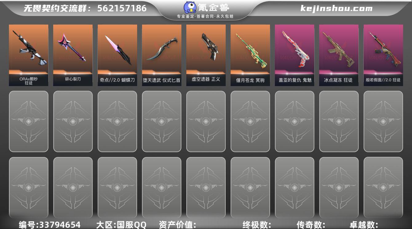 【 特价走量】精品手慢无系列!【绝版悲悯之刃+全热门武器皮肤】 【套装】:无畏契约季前邀请赛套装【近战武器】:近战武器-碎心裂刃,近战武器-无畏契约季前邀请赛 悲悯之刃,近战武器-奇点//2.0 蝴蝶刀,近战武器-堕天遗武 仪式匕首 【狂徒】:狂徒-ORA x 颗秒,狂徒-般若假面//2.0,狂徒-冰点凝冻 【冥驹】:冥驹-偃月苍龙 【正义】:正义-虚空遗器 【鬼魅】:鬼魅-盖亚的复仇 【英雄】:幻棱,炼狱,维斯,暮蝶,铁臂,捷风,雷兹,不死鸟,贤者,猎枭,芮娜,奇乐,尚勃勒,黑梦 【卡面】:热舞环节 卡面,无畏契约GO!第一卷:芮娜 卡面,无畏契约GO!第一卷:零 卡面,《双城之战》金克丝 卡面,代号红色 卡面,新兵报到 卡面,V契约 卡面,无畏契约 卡面 【喷漆】:霓光四射 喷漆,买装还是存钱 喷漆,关门放狗 喷漆,无畏契约GO!第一卷:零 喷漆,胜利属于无畏契约 喷漆,GLHF 喷漆,无畏契约 喷漆 【挂饰】:无畏契约GO!第一卷 零 挂饰,天外飞客 挂饰,无畏契约 纪念币 挂饰
