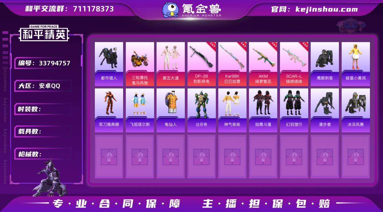 DSH2441【1载具-1粉装-4特效枪 都市猎人 第五大道】安卓手Q-1载具-1粉装-4特效枪-106套装-159枪皮-5王牌印记-英勇黄金Ⅰ-43368热力值【1载具】鬼马风驰【1粉装】第五大道【4特效枪】DP-28-豹影疾电[5级],AKM-绿萝繁花[5级],Kar98K-巳巳如意[5级],SCAR-L-锦绣绵绵[5级]【1稀有】都市猎人【2飞行器】空岛之星尾迹,千面幻镜飞行器【1头盔】梦幻火箭头盔【259其它衣服和枪皮】酷潮明星,白熊同盟,街舞达人,快闪甜心,白糯汤圆,SS20特训,老实芭蕉,薄荷星砂,SS27特训,角色-军刀雅典娜,幻彩翩翩,SS28特训,黄色名流,飞狐塔尔斯,战术大师,SS25特训,娇憨猪猪,霓虹街区,SS29特训,竞技名士,萌萌史莱姆,萌趣咩咩,锦衣飞扬,空岛之星,长空猛禽,灼焰舞者,无暇誓言,特殊使命,SS26特训,漫游都市,湖蓝色名流,黄色伏地魔,萌黄之夏,SS19特训,猎梦纪元,冰冻风暴,机械哨兵,龙腾端午,白啸长虹,甜心亚梦,光之冒险,妙红点点,龟仙人,幻世战舞者,角色-孙悟空,飞行日记,魅力单车,涂山之恋,吉莉礼服,特训学院,破蛋小黄鸡,幻影武者,猛禽,轻风白浪,SS24特训,绮丽涂鸦,SS35特训,SS31特训,SS33特训,王牌教练,幻羽潜行,竞技角斗士,黎明保卫者,人气偶像,云魄琉璃,森林游猎者,萝萝小趴兔,虚音幻奏,神气柴柴,清新柠檬,角...