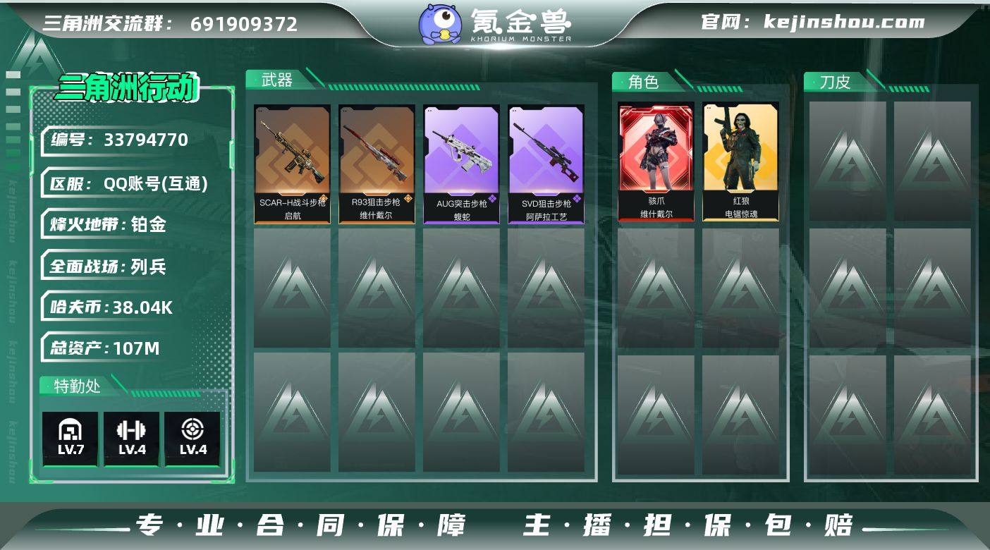 DSJZ1843【资产107.6M 电锯惊魂红狼 维什戴尔】三端互通-总价值107.62M-哈夫币38,045.21-烽火地带等级40-烽火地带段位铂金【干员皮肤】骇爪-维什戴尔 红狼-电锯惊魂【近战武器】黑鹰【枪皮】M4A1突击步枪-粉色涂装 M4A1突击步枪-高雅黑 AKM突击步枪-肃杀 QBZ95-1突击步枪-高雅黑 QBZ95-1突击步枪-海浪 QBZ95-1突击步枪-海色 QBZ95-1突击步枪-2026 QBZ95-1突击步枪-公平竞技 AKS-74U突击步枪-冰天雪地 K416突击步枪-几何迷彩 K416突击步枪-一帆风顺 K416突击步枪-阿萨拉特攻 M16A4突击步枪-高雅黑 AUG突击步枪-浅蓝涂装 AUG突击步枪-蝮蛇 M7战斗步枪-黑巧甜心 M7战斗步枪-捣蛋鬼 SG552突击步枪-狂欢 SG552突击步枪-2026 SG552突击步枪-贴花艺术 SCAR-H战斗步枪-数码迷彩 SCAR-H战斗步枪-荣耀列队 SCAR-H战斗步枪-启航 G3战斗步枪-高雅黑 PTR-32突击步枪-黄蜂 CAR-15突击步枪-狂欢 AS Val突击步枪-黑巧甜心 腾龙突击步枪-猎鳄行动 K437突击步枪-锦绣 KC17突击步枪-电锯惊魂 MP5冲锋枪-海色 MP5冲锋枪-哈夫克卫队 MP5冲锋枪-战术竞备 MP5冲锋枪-竞技风 P90冲锋枪-黑巧甜心 P90冲锋枪-黄昏 P90冲锋枪-捣蛋鬼 Vector冲锋枪-几何迷彩 UZI冲锋枪-海色 UZI冲锋枪-狂欢 UZI冲锋枪-亚特...