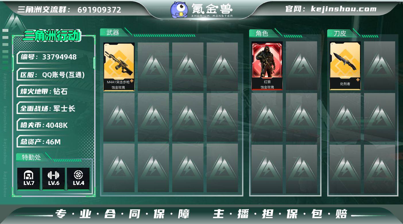 【961636】DSJZ1858【红狼-蚀金玫瑰 处刑者】无二次【总资产(M)】46.87【哈夫币】4048k【行动等级】60【烽火地带段位】钻石【干员皮肤】 红狼-蚀金玫瑰 【近战武器】 黑鹰 处刑者 【枪皮】PTR-32徒步几千-噬菌体 ASh-12战斗步枪-碎冰行动 M4A1突击步枪-高雅黑 M4A1突击步枪-海色 M4A1突击步枪-蚀金玫瑰 AKM突击步枪-肃杀 QBZ95-1突击步枪-海色 QBZ95-1突击步枪-2026 AKS-74U突击步枪-冰天雪地 K416突击步枪-几何迷彩 K416突击步枪-高雅黑 K416突击步枪-一帆风顺 M16A4突击步枪-高雅黑 AUG突击步枪-浅蓝涂装 AUG突击步枪-悠然茶歇 M7战斗步枪-红色涂装 M7战斗步枪-黑巧甜心 M7战斗步枪-前沿科技 SG552突击步枪-浅蓝涂装 SG552突击步枪-海浪 SG552突击步枪-狂欢 SG552突击步枪-2026 SG552突击步枪-贴花艺术 AK-12突击步枪-马年新春 SCAR-H战斗步枪-数码迷彩 G3战斗步枪-高雅黑 AS Val突击步枪-黑巧甜心 腾龙突击步枪-猎鳄行动 腾龙突击步枪-万金泪冠 47突击步枪-悠然茶歇 SMG-45冲锋枪-蝴蝶 SR-3M紧凑突击步枪-巨兽 MP5冲锋枪-黄蜂 MP5冲锋枪-哈夫克卫队 MP5冲锋枪-竞技风 P90冲锋枪-黑巧甜心 Vector冲锋枪-夜莺 UZI冲锋枪-海色 UZI冲锋枪-狂欢 UZI冲锋枪-一帆风顺 UZI冲锋枪-悠...