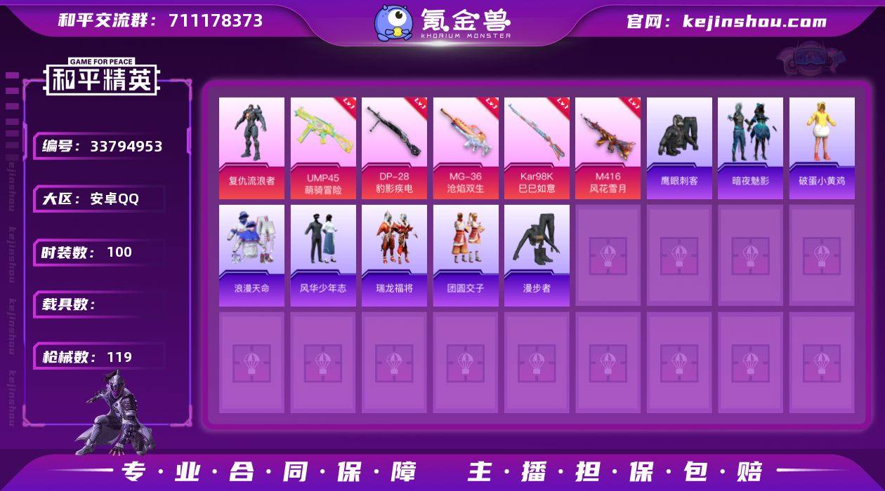 DYH18132【1粉装-6特效枪 浪漫天命 M4风花雪月7级】安卓手Q-1粉装-6特效枪-100套装-119枪皮-4王牌印记-不朽星钻Ⅴ-33325热力值【1粉装】角色-复仇流浪者【6特效枪】M416-风花雪月[7级],DP-28-豹影疾电[5级],Mk14-福马献瑞[5级],Kar98K-巳巳如意[4级],UMP45-萌骑冒险[5级],MG-36-沧焰双生[5级]【1稀有】浪漫天命【3飞行器】荒原烈焰飞行器,鸡智如我飞行器,异域银装飞行器【211其它衣服和枪皮】耀粉歌者,SS34特训,龙魂突击队,马上来财,黑色伏地魔,SS17特训,魅力单车,元气之梦,蝶变,时空追击者,夜幕侵蚀,怒火燎原,竞技达人朋克,白糯汤圆,SS21特训,冰川特警,滨海假日,SS15特训,破蛋小黄鸡,顶瓜瓜,游乐,SS19特训,蓝色守护者,萌趣咩咩,异域银装,黄色运动,暗夜魅影,红色运动,角色-银尘,阳光火鸡,SS32特训,乐游熊熊,猎鹰,海岛探路者,朱霞炽焰,长空猛禽,灼焰舞者,完美偶像,SS18特训,福马献瑞,鹰眼刺客,刚毅裁决者,SS35特训,格斗先锋,缤纷果语,白色伏地魔,冰爽风暴,大橘大利,SS20特训,薄荷星砂,酒红色名流,SS16特训,海盐绵绵冰,快乐星愿,湖蓝色名流,SS38特训,黄色伏地魔,SS23特训,凌霄紫焰,朋克治安官,SS33特训,漫步者,吉莉礼服,SS22特训,蓝色运动,SS37特训,SS29特训,狙击之神,空投萌叽,...