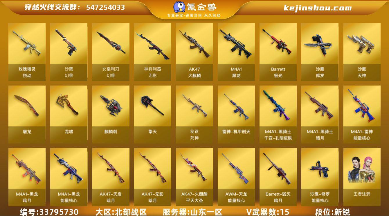 【ky7021】山东一区-16V-1王者武器数-0炫金武器数 【热门武器】:死亡之眼,沙鹰-修罗,高爆手雷-幻兽 【王者炫金武器】:玫瑰精灵-悦动 【皮肤】:雷神-能量核心,雷神-机甲刑天皮肤,火麒麟-平天大圣,毁灭-暗月*2,M4A1-千变-孔明皮肤,黑龙-能量核心,黑龙-暗月,黑骑士-暗月*2,无影-暗月,死神-秘银*4,天启-暗月,天龙-能量核心,极光-能量核心,修罗-能量核心,天神-暗月*2 【角色】:葵,王者涂鸦,风暴女,灵狐-花神,灵狐者-七夕宝贝,龙儿,龙儿-小淘气,潘多拉-甜心教官,斯沃特-X,雪莉杨-摸金校尉,夜玫瑰-幻能朋克,樱-战斗天使 【人偶武器】:火麒麟-灵狐,生化手雷-机甲核心 【暴走生化】:死亡之眼 【英雄级武器】:AK47-火麒麟,M4A1-黑龙,无影-神兵利器,Barrett-极光,沙鹰-修罗,沙鹰-天神,沙鹰-幻兽,屠龙,龙啸,擎天,麒麟刺,女皇利刃-幻兽,高爆手雷-幻兽,闪光弹-幻兽,烟雾弹-幻兽 【其他武器】:源·火麒麟,源·雷神,魂-雷神-萌杀,M4A1-十二生肖·龙-雷神,御·雷神-葫芦兄弟,魂·黑骑士-幻能朋克,御·黑骑士·哪吒闹海,魂-死神-机甲核心,源·武圣,源·机械迷城,魂·QBZ03-金色蔷薇-萌杀,源·天龙,源·毁灭,魂·毁灭-青帝*2,源·炼狱,御·炼...