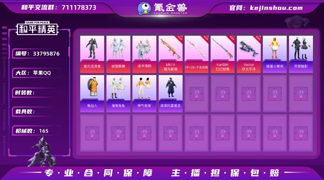 XS11622+【 粉装3 特效枪5 龟仙人 蓝螳螂】苹果手Q-3粉装-5特效枪-107套装-165枪皮-7王牌印记-坚韧铂金Ⅲ-48538热力值【3粉装】绒雪飘舞,角色-复仇流浪者,金丰海韵【5特效枪】Vector-环太平洋[7级],Kar98K-巳巳如意[5级],AA12-G-萌骑幻想[4级],DP-28-千金淑猫[5级],Mk14-福马献瑞[5级]【5飞行器】顶峰精英尾迹,狂鲨锋刃飞行器,粉色滑翔尾迹,马上有福飞行器,光之冒险尾迹【1背包】神秘黑猫背包【264其它衣服和枪皮】糖糖葫芦,角色-孙斩天,SS27特训,缤纷果语,娇憨猪猪,萝兰蝴蝶,荧惑魅影,蓝色守护者,龙魂突击队,探宝勇士,轻风白浪,虚音幻奏,破蛋小黄鸡,冰河战士,香桃花海,热血青春,虎虎生威吉莉,酒红色名流,神秘领域,幻世战舞者,长空猛禽,SS29特训,耀眼新星,迅捷龙虾,青玉碎影,暖心熊熊,牛气冲天,猛禽,SS31特训,馥郁哈密,角色-都市丽猫,龙的传人,蝶变,角色-Mark.06,蓝色运动,萌黄之夏,冷焰舞者,SS23特训,幻彩翩翩,角色-英勇保护者,妙红点点,青团波波,SS30特训,福马献瑞,锦衣飞扬,SS21特训,空岛之星,巳巳如意,甜心亚梦,萌趣咩咩,战术大师,SS25特训,萌趣颜团子,懵萌河马,角色-情公主,六六大吉,SS24特训,元素星魂,疯狂小兔子,湖蓝色名流,时尚圣诞,福星高照,牛气满满,小熊娃娃,魅力...