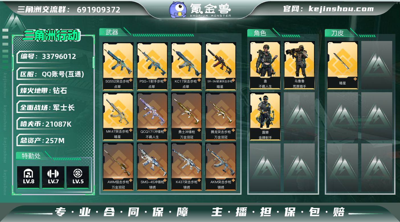 【PTSJZ3847】总资产257M/哈夫币2108万/传说近战数1/传说枪皮数16/战场等级18/行动等级60/安全箱等时效性道具以游戏内数据为准,详情请看图/露娜-金牌射手(S7)/乌鲁鲁-荒原猎手/蛊-不羁人生/近战-暗星/近战-处刑者2级/近战-黑鹰/AKM突击步枪-锦绣/SG552突击步枪-运动员/SG552突击步枪-点翠/腾龙突击步枪-万金泪冠/K437突击步枪-锦绣/KC17突击步枪-电锯惊魂/KC17突击步枪-点翠/MK47突击步枪-暗星/SMG-45冲锋枪-锦绣/SR-3M紧凑突击步枪-暗星/勇士冲锋枪-万金泪冠/QCQ171冲锋枪-不羁人生/M14射手步枪-蛮荒/SKS射手步枪-骑士/PSG-1射手步枪-点翠/AWM狙击步枪-万金泪冠/K416突击步枪-冬日风情/K416突击步枪-腊梅/K416突击步枪-缄默情歌/M7战斗步枪-百步穿杨/SG552突击步枪-哈夫克警备/G3战斗步枪-流沙送葬/G3战斗步枪-哈夫克警备/AS Val突击步枪-百步穿杨/腾龙突击步枪-猎鳄行动/K437突击步枪-丛林谍踪/KC17突击步枪-缄默情歌/MP5冲锋枪-竞技风/Vector冲锋枪-阿萨拉文明/Vector冲锋枪-猎鳄行动/Vector冲锋枪-百步穿杨/SMG45冲锋枪-阿萨拉特攻/SR-3M紧凑突击步枪-开工大吉/勇士冲锋枪-深海恐惧/勇士冲锋枪-丛林谍踪/MP7冲锋枪-六套之力/S12K霰弹枪-缄默情歌/M249轻机枪-丛林谍踪/QJB...
