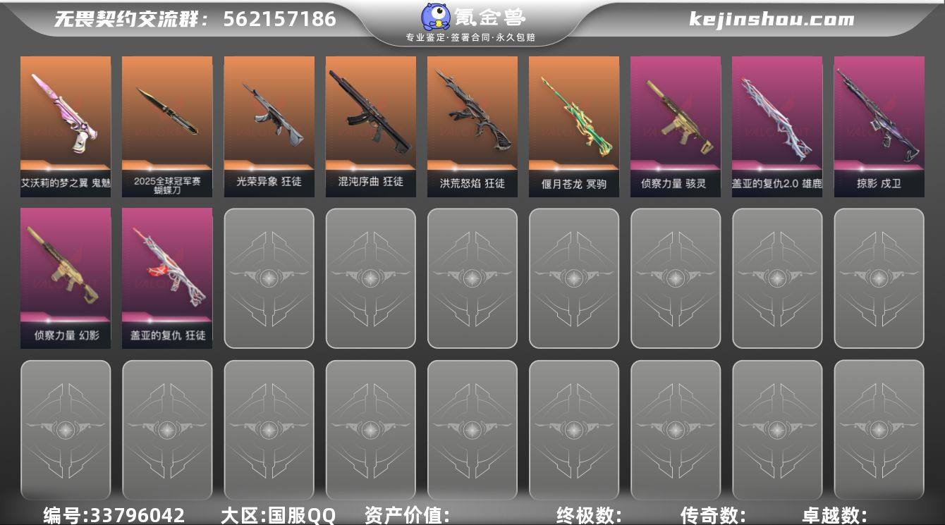 【套装】:2025全球冠军赛套装,荆刺圣骸套装,VCT 2026 赛季套装,滋滋X特攻队套装,原子裂解套装 【英雄】:幻棱,炼狱,维斯,暮蝶,壹决,铁臂,捷风,雷兹,幽影,不死鸟,贤者,猎枭,蝰蛇,零,芮娜,奇乐,尚勃勒,霓虹,星礈,黑梦 【近战武器】:近战武器-2025全球冠军赛 蝴蝶刀,近战武器-蒙太奇 战斧,近战武器-荆刺链刃,近战武器-碎心裂刃,近战武器-VCT 2026 篆刀,近战武器-嘟昂嘟昂超弹力水球拳套,近战武器-紫金爪刀,近战武器-彩虹魔力大棒槌,近战武器-街机高手,近战武器-阿特拉斯指挥部 甩棍,近战武器-星际猎兵 短剑 【狂徒】:狂徒-2025全球冠军赛,狂徒-洪荒怒焰,狂徒-混沌序曲,狂徒-光荣异象,狂徒-滋滋X特攻队,狂徒-荆刺圣骸,狂徒-盖亚的复仇,狂徒-彩虹魔力小白马 【幻影】:幻影-侦察力量,幻影-异鳞魔蛇,幻影-蒙太奇 【戍卫】:戍卫-荆刺圣骸,戍卫-掠影 【獠犬】:獠犬-超时空卫队,獠犬-原子裂解 【冥驹】:冥驹-偃月苍龙,冥驹-滋滋X特攻队 【飞将】:飞将-荆刺圣骸,飞将-原子裂解 【莽侠】:莽侠-超时空卫队,莽侠-神罚//2.0 【战神】:战神-蒙太奇 【判官】:判官-原子裂解 【雄鹿】:雄鹿-盖亚的复仇//2.0 【骇灵】:骇灵-侦察力量...
