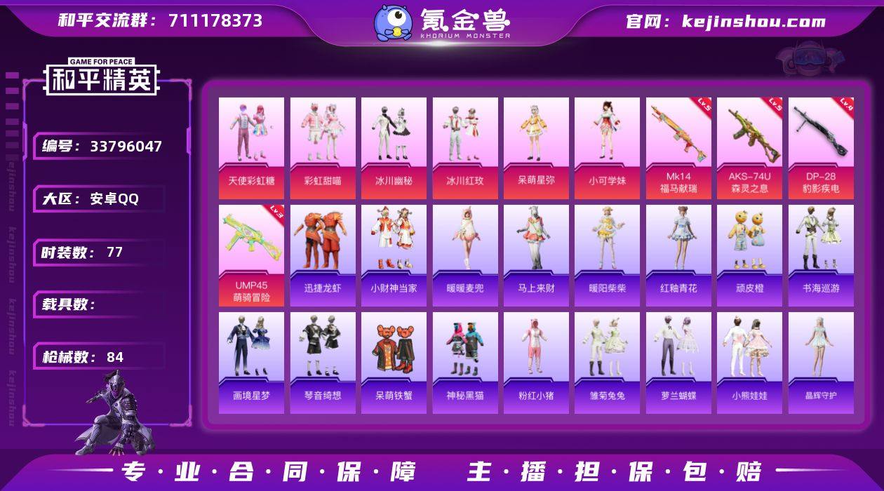 【8517】6粉装-4特效枪-0载具-0粉色飞行器-27267热力值-3王牌印记-77套装-84枪皮 【热门品类】:套装-粉红小猪 【粉色套装】:粉装-天使彩虹糖,粉装-彩虹甜喵,粉装-冰川幽秘,粉装-冰川红玫,角色-呆萌星弥,角色-小可学妹 【粉色枪皮等级】:UMP45-萌骑冒险(三级),AKS-74U-森灵之息(五级),Mk14-福马献瑞(五级),DP-28-豹影疾电(四级)