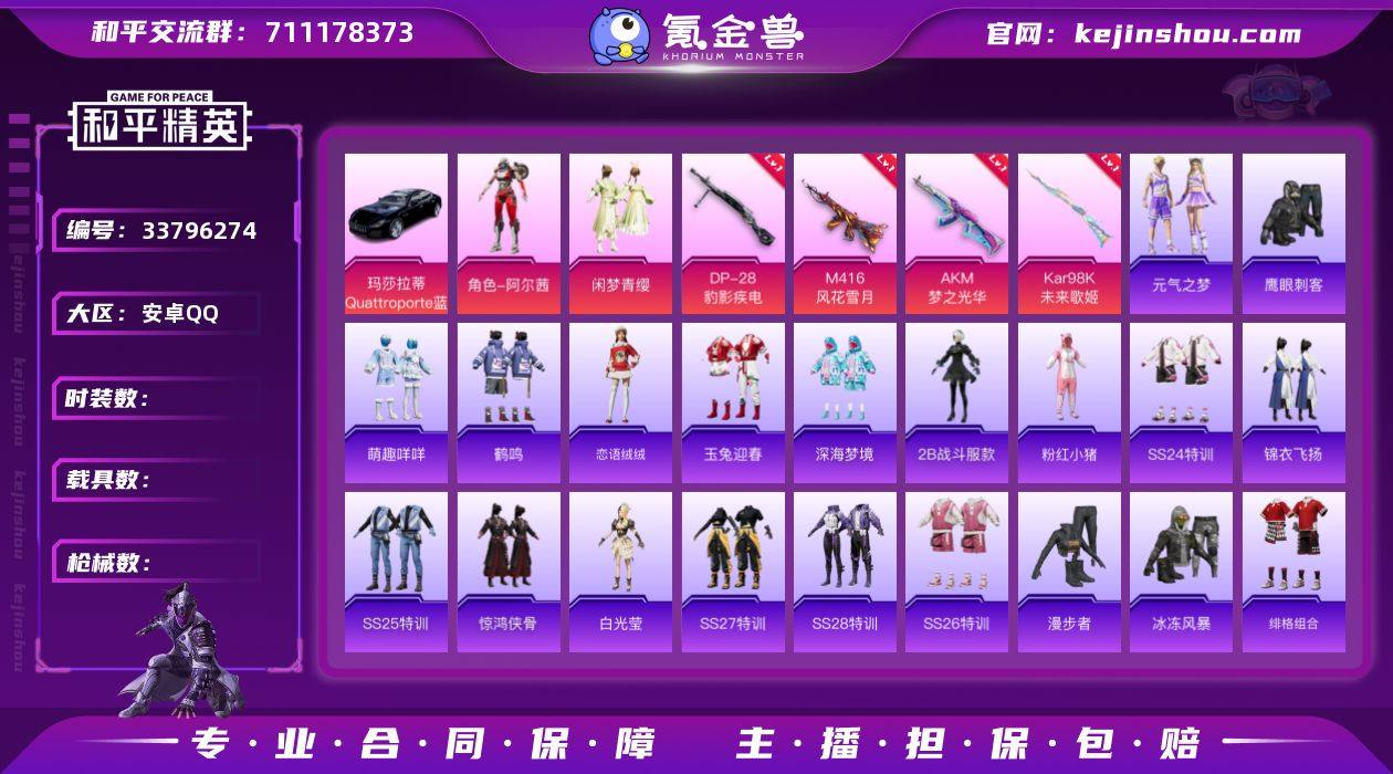 WJ932安卓手Q-1载具-2粉装-5特效枪-58套装-97枪皮-3王牌印记-不朽星钻Ⅳ-26503热力值【1载具】玛莎拉蒂Quattroporte(夜幕蓝)【2粉装】角色-阿尔茜,闲梦青缨【5特效枪】Mk14-福马献瑞[4级],M416-风花雪月[5级],Kar98K-未来歌姬[2级],AKM-梦之光华[4级],DP-28-豹影疾电[4级]【3飞行器】粉色滑翔尾迹,空岛之星尾迹,马上有福飞行器【1头盔】幻影战神头盔【148其它衣服和枪皮】湖蓝色名流,SS22特训,玉兔迎春,六六大吉,海盐绵绵冰,惊鸿侠骨,SS28特训,街头潮人,牛气冲天,鹰眼刺客,战地督导,漫步者,角色-白光莹,阳光火鸡,娇憨猪猪,恋语绒绒,耀眼新星,元气之梦,妙红点点,魅力单车,SS23特训,长空猛禽,牛气满满,蓝色运动,熠彩粉晶,福马献瑞,疯狂小兔子,锦衣飞扬,元素星魂,粉红小猪,幻彩翩翩,海岛探路者,迅捷龙虾,角色-2B战斗服款,竞技名士,都市魅力,SS24特训,萌趣咩咩,深海梦境,潮流炫酷,SS26特训,冰冻风暴,SS31特训,猎鹰,SS37特训,SS38特训,SS34特训,马上有钱,霓虹街区,狙击之神,SS25特训,SS21特训,龙的传人,SS27特训,鹤鸣,绯格组合,平底锅-妙红点点,SLR-彩虹符号,燃烧瓶-福马献瑞,QBZ-未来歌姬,撬棍-环太平洋,汤姆逊-天降萌叽,大砍刀-像素花束,SPAS-12-狂鲨锋刃,AMR-妙红点点,S12K-夜灯,...