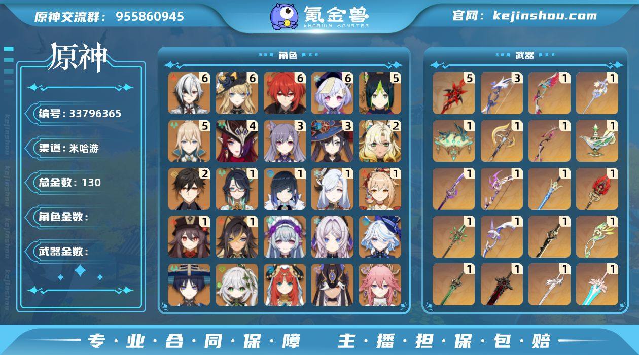 邮箱: 不送邮/死邮 总黄数: 130 冒险等级: 60 6命金色角色: 满命迪卢克,满命七七,满命娜维娅,满命阿蕾奇诺 5命金色角色: 五命琴,五命提纳里 4命金色角色: 四命恰斯卡 3命金色角色: 三命刻晴,三命莫娜 2命金色角色: 二命钟离,二命希诺宁 1命金色角色: 一命宵宫,一命胡桃,一命申鹤,一命夜兰,一命迪希雅,一命闲云 0命金色角色: 温迪,枫原万叶,优菈,神里绫华,可莉,甘雨,魈,雷电将军,珊瑚宫心海,八重神子,赛诺,妮露,纳西妲,流浪者,芙宁娜,茜特菈莉,梦见月瑞希 5精武器: 赤月之形 3精武器: 若水 1精武器: 狼的末路,天空之翼,飞雷之弦振,四风原典,天空之卷,和璞鸢,阿莫斯之弓,天空之傲,风鹰剑,天空之刃,斫峰之刃,天空之脊,磐岩结绿,护摩之杖,薙草之稻光,苍古自由之誓,猎人之径,千夜浮梦,最初的大魔术,裁断,鹤鸣余音,柔灯挽歌,星鹫赤羽 亮点: 6+5仆人