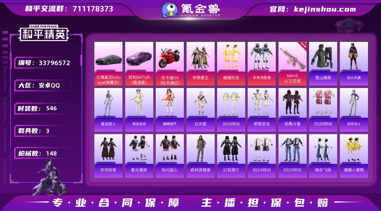 【特价出售】安卓Q-3载具3粉装1特效枪9热门132套装148枪皮 47213热力值 4印记 历史卓越王牌8星 【3载具】 宾利BATUR(极速紫) 杜卡迪V4(杜卡迪红) 兰博轿车灰色 【3粉装】 暖暖奶龙 未来领航者 华贵君王 【1特效枪】 M416-心之恋语 (6级) 【9热门】 龟仙人 雪山精英 潮萌小黄鸭 梦魇先生 万圣娃娃 花面小丑 抹茶蜜豆 破蛋小黄鸡 黑色刀锋 【1头盔】 心之恋语头盔 【4背包】 银河战甲背包 折纸暴龙背包 幻影战神背包 心之恋语背包
