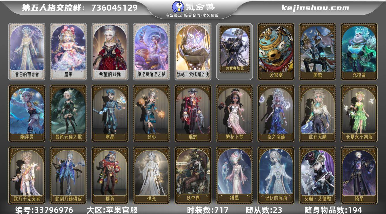 用过单字名仙 历史a守夜b古董 古董大情号 挂件全有 皮肤除了深渊和旺仔都有 面板好看全是保值皮