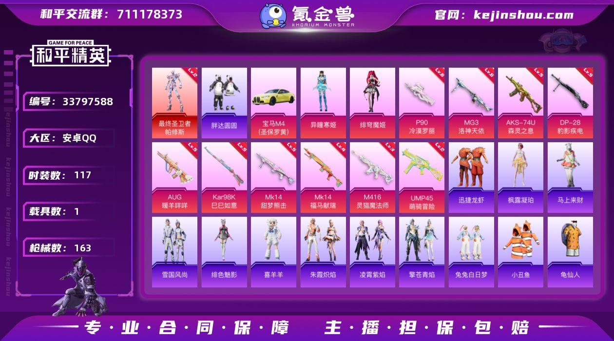 【AYH767】安卓 手Q-1神装-2粉装-10特效枪-1载具-4粉色飞行器-54029热力值-4王牌印记-117套装-163枪皮 【红色神装等级】:最终圣卫者-帕修斯(二级) 【红色角色神装】:最终圣卫者-帕修斯 【热门品类】:套装-小丑鱼,套装-胖达圆圆,套装-龟仙人 【粉色套装】:角色-绯穹魔姬,角色-异瞳寒姬 【粉色枪皮等级】:M416-灵猫魔法师(三级),AUG-暖羊咩咩(五级),UMP45-萌骑冒险(二级),AKS-74U-森灵之息(五级),P90-冷漠罗丽(六级),Kar98K-巳巳如意(五级),Mk14-甜梦熊击(五级),Mk14-福马献瑞(四级),DP-28-豹影疾电(五级),MG3-洛神天依(六级) 【粉色载具】:宝马M4(圣保罗黄) 【粉色枪皮】:M416-灵猫魔法师,AUG-暖羊咩咩,UMP45-萌骑冒险,AKS-74U-森灵之息,P90-冷漠罗丽,Kar98K-巳巳如意,Mk14-甜梦熊击,Mk14-福马献瑞,DP-28-豹影疾电,MG3-洛神天依 【粉色飞行器】:炫彩糖果飞行器,灵猫魔法师飞行器,飞天猪飞行器,灵珠游龙飞行器 【粉色降落伞】:星之彼岸降落伞,雪月幻音降落伞,荧海星豚降落伞,灵猫魔法师降落伞,魔童闹海 敖丙降落伞,炫彩糖果降落伞 【稀有套装】:套装-龟仙人,套装-暖暖向日葵,套装-雪国风尚,套装-炫彩糖果,套装-马上来财,套装-迅...