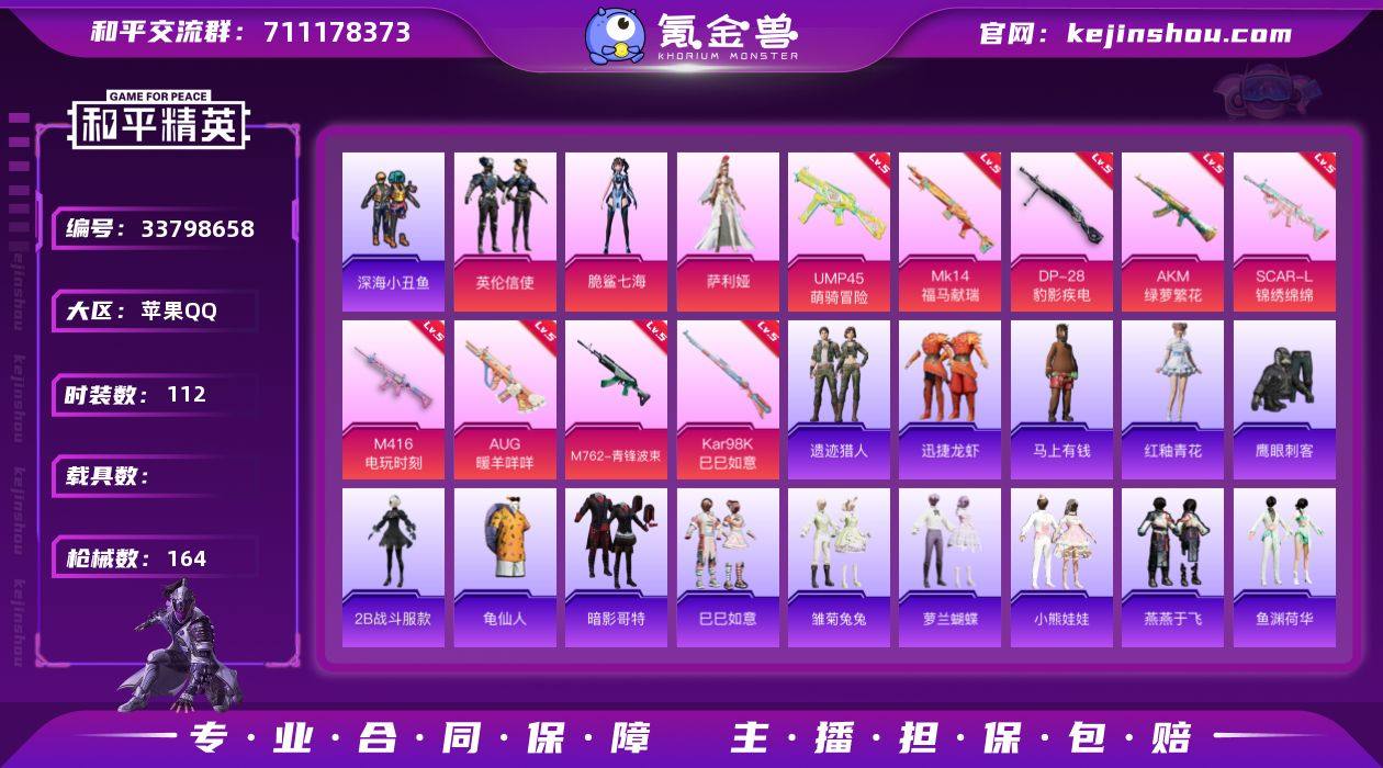 苹果 手Q-3粉装-9特效枪-0载具-2粉色飞行器-47114热力值-8王牌印记-112套装-164枪皮 【热门品类】:套装-深海小丑鱼,角色-2B战斗服款,套装-龟仙人,套装-暗影哥特 【粉色套装】:粉装-英伦信使,角色-脆鲨七海,角色-萨利娅 【粉色枪皮等级】:AKM-绿萝繁花(五级),SCAR-L-锦绣绵绵(五级),M416-电玩时刻(五级),AUG-暖羊咩咩(五级),M762-青锋波束(五级),UMP45-萌骑冒险(五级),Kar98K-巳巳如意(五级),Mk14-福马献瑞(五级),DP-28-豹影疾电(五级) 【粉色枪皮】:AKM-绿萝繁花,SCAR-L-锦绣绵绵,M416-电玩时刻,AUG-暖羊咩咩,M762-青锋波束,UMP45-萌骑冒险,Kar98K-巳巳如意,Mk14-福马献瑞,DP-28-豹影疾电 【粉色飞行器】:齐天大圣飞行器 【粉色降落伞】:炫光之旅降落伞,圣堂之誓降落伞,绝色倾城降落伞,电糖天使降落伞,精灵梦叶罗丽降落伞,BEARBRICK降落伞,月下星之子降落伞 【稀有套装】:套装-龟仙人,套装-巳巳如意,套装-马上有钱,套装-迅捷龙虾,套装-遗迹猎人,套装-雏菊兔兔,套装-萝兰蝴蝶,套装-小熊娃娃,套装-燕燕于飞,套装-鱼渊荷华,角色-糖霜甜心,套装-雨过天青,套装-红釉青花 【稀有枪皮】:AKM-2P战斗服款,AKM-彩虹符号,AKM-恐龙拽拽...