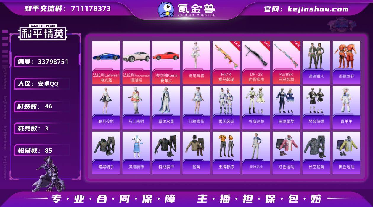 安卓 手Q-1粉装-3特效枪-3载具-1粉色飞行器-24356热力值-3王牌印记-46套装-85枪皮 【粉色套装】:角色-鸢尾珑雾 【粉色枪皮等级】:Kar98K-巳巳如意(五级),Mk14-福马献瑞(五级),DP-28-豹影疾电(五级) 【粉色载具】:法拉利LaFerrari(电光蓝),法拉利Purosangue(珊瑚粉),法拉利Roma(赛车红) 【粉色枪皮】:Kar98K-巳巳如意,Mk14-福马献瑞,DP-28-豹影疾电 【粉色飞行器】:炫彩糖果飞行器 【粉色降落伞】:洛神天依降落伞,忍者神龟降落伞,炫彩糖果降落伞,虹云熊熊降落伞,虎痴许褚降落伞 【稀有套装】:套装-雪国风尚,套装-炫彩糖果,套装-马上来财,套装-迅捷龙虾,套装-遗迹猎人,玩偶服-喜羊羊,套装-书海巡游,套装-画境星梦,套装-琴音绮想,套装-雨过天青,套装-红釉青花,角色-霜纹水星,角色-皓月伶影 【稀有枪皮】:AUG-冰晶雪宝,AKM-破晓战魂,AKM-龙的传人,M16A4-红色方程式,SCAR-L-炫彩节奏,M416-蓝色火焰,AUG-耀粉歌者,QBZ-洛神天依,Mk47-洛神天依,AC-VAL-天降萌叽,蜜獾-虎痴许褚,ACE32-画境星梦,UZI-红色方程式,汤姆逊-耀粉歌者,汤姆逊-像素花束,MP5K-画境星梦,SKS-糯团青竹,Mini14-耀粉歌者,M1加兰德-画境星梦,S686-生命誓言,...
