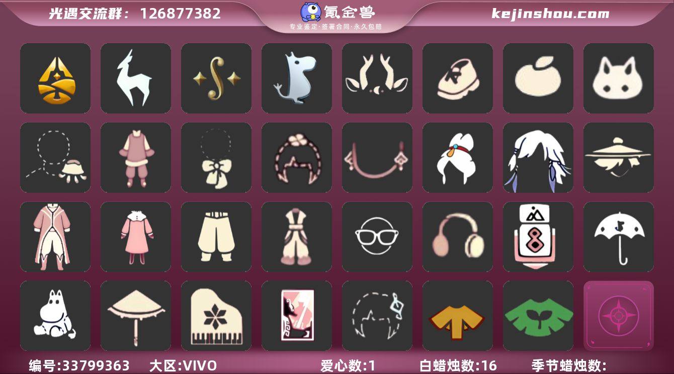 账号类型: 手机账号 季节已毕业: 归巢季,九色鹿季,二重奏季,姆明季 完成地图: 霞谷 珍稀物品: 彩虹围巾 礼包: 九色鹿角,运动鞋,橘子,兔子,水母,新年裤,蝴蝶结,四叶草,新年耳钉 裤子: 武士裤,妮妮裙子,飞天裤,青鸟尊贵蓬头裤子 面饰: 红耳机,黑框眼镜 发型: 归巢毕业发型,若笠,飞天盘发 头饰: 蓝色音乐会 斗篷: 黄色蓑衣,绿芽 配饰: 雨伞,高音钢琴,姆明抱枕,小红伞,相机,二重奏挂画 亮点: 【优质装备】:武士裤,青鸟尊贵蓬头裤子(蓝色燕尾服),归巢毕业发型(五塑彩羽发),高音钢琴(白色高脚钢琴),姆明抱枕,相机(季卡相机),归巢季,飞天裤(柔缎花边连)(九色鹿丝带裤),九色鹿角(神鹿祝福头饰)(神鹿祝福礼包),霞谷,若笠(箬笠),妮妮裙子(妮妮长裙),小红伞(姆明红伞)(姆明大伞),彩虹围巾(五塑彩带斗),九色鹿(九色鹿季),二重奏季,二重奏挂画(合奏挂画),姆明季,黑框眼镜(粗框眼镜),飞天盘发(九色鹿丸子头),红耳机,新年裤(瑞气服饰),运动鞋(跃动跑鞋),蝴蝶结(大蝴蝶结),兔子(玉兔头饰)(玉兔发饰)(兔子发饰),水母(水母肩饰),新年耳钉(金鳞耳饰),橘子(大橘大利),四叶草(四叶草头饰)