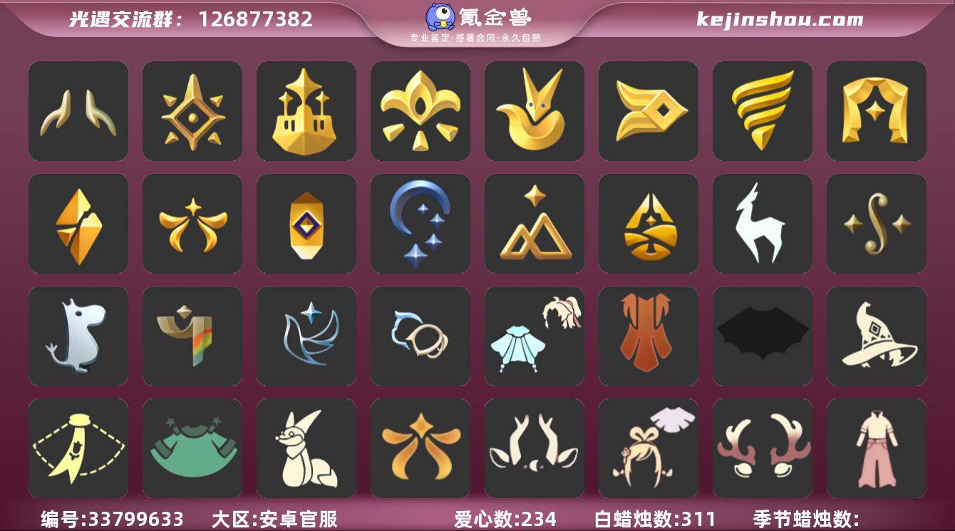 账号类型: 手机账号 季节已毕业: 预言季,梦想季,小王子季,风行季,潜海季,表演季,破晓季,欧若拉季,集结季,夜行季,追忆季,拾光季,归巢季,九色鹿季,二重奏季,姆明季,彩染季,青鸟季,双星季,织光季 完成地图: 晨岛,云野,雨林,霞谷,暮土,禁阁 珍稀物品: 阿努比斯(狗头),白枭,透明蝶翼斗,玫瑰花,彩虹围巾 礼包: 蝙蝠套,巫师,围巾,星球斗,小狐狸,欧若拉之翼,九色鹿角,绊爱,鹿角,牛仔裤,秋千,茶桌,白绒金,女巫裙,福娃,跷跷板,小船,吉他,灯笼,致爱装扮,人声乐器,雪花球,橘子,红伞,兔子,南瓜,雪花,水母,猫背饰,星月头饰,彩虹耳钉,彩虹耳机,四叶草,暗彩装扮,伯爵斗篷,伯爵面具,新年耳钉,创始人,日光耳环,奉献斗篷,青衫落拓礼包 裤子: 武士裤,背带裤,搓澡巾,击剑裤,妮妮裙子,王子服,蓝绿裤,飞天裤,青鸟尊贵蓬头裤子 面具: 阿努比斯,九色鹿面具,凤凰面具,裂纹面具,贴花面具,呼吸面具,夜行毕业面具,黄眉企鹅面具,辉光羚羊面具 面饰: 红耳机,黑框眼镜,青鸟毕业面饰 项链: 围巾 发型: 归巢毕业发型,若笠,虚荣,单侧绑发,小王子发型,留辫蘑菇头,飞天盘发 头饰: 行军锅头盔,羽毛发饰,牛仔帽,蓝色音乐会,平顶帽 斗篷: 黄色蓑衣,海洋斗,蟑螂斗,绿芽,粉红绒毛斗篷,遥鲲斗篷,黄色连帽披风,燕尾斗篷,...