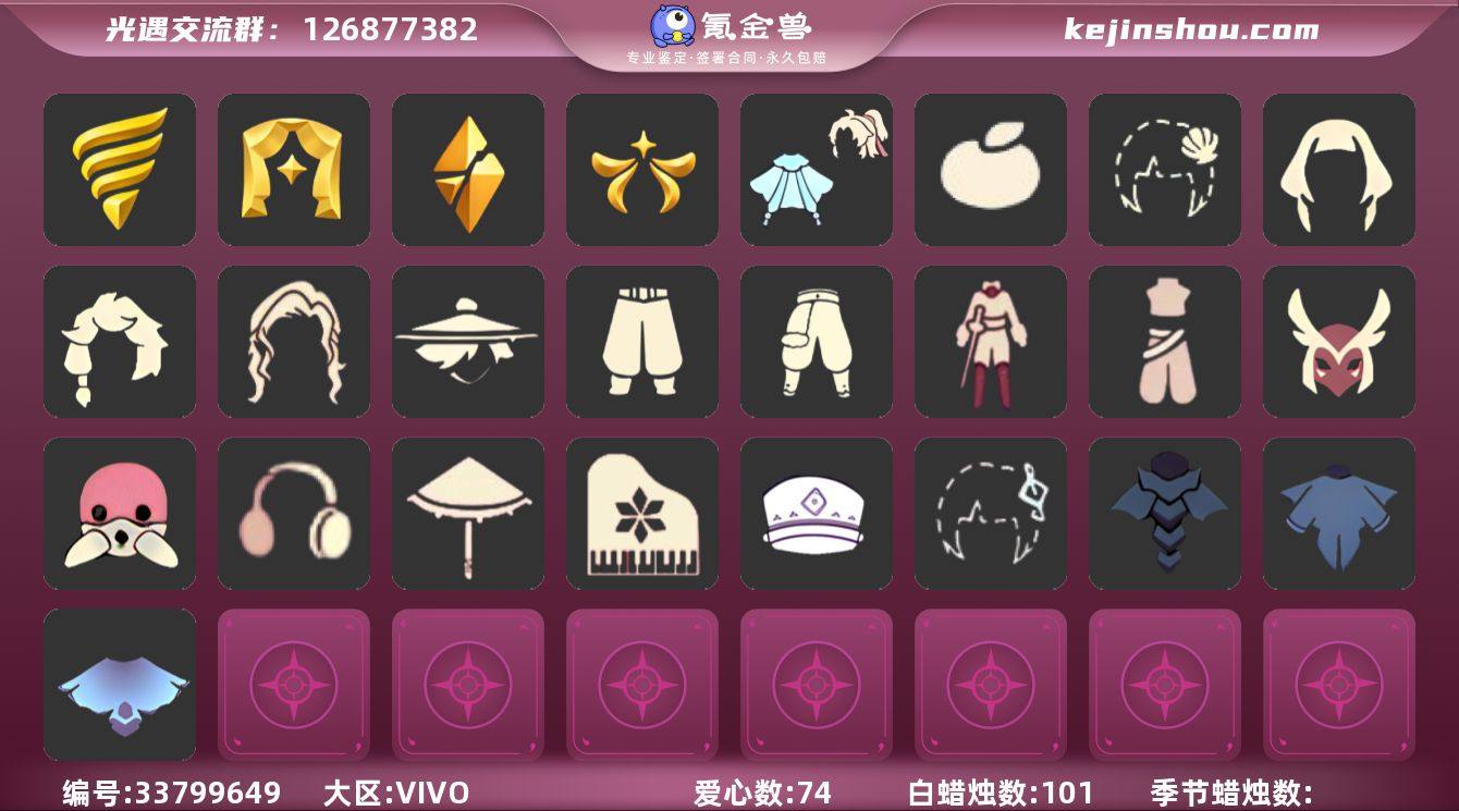 账号类型: 手机账号 季节已毕业: 潜海季,表演季,破晓季,欧若拉季 完成地图: 晨岛,云野,雨林,霞谷 珍稀物品: 白枭,透明蝶翼斗 礼包: 橘子,贝壳,青衫落拓礼包 裤子: 武士裤,搓澡巾,击剑裤,蓝绿裤 面具: 呼吸面具,黄眉企鹅面具 面饰: 红耳机 发型: 若笠,虚荣,单侧绑发,留辫蘑菇头 头饰: 蓝色音乐会,平顶帽 斗篷: 遥鲲斗篷,燕尾斗篷,冥龙斗篷 配饰: 雨伞,高音钢琴 亮点: 【优质装备】:表演季,白枭(帝企鹅发),武士裤,潜海季,破晓季,透明蝶翼斗,欧若拉季(欧若拉),高音钢琴(白色高脚钢琴),蓝绿裤(高领舞服),呼吸面具(潜水面具),黄眉企鹅面具,单侧绑发(单边小辫),留辫蘑菇头,遥鲲斗篷(双翼遥鲲斗),燕尾斗篷,冥龙斗篷,红耳机,晨岛,云野,雨林,霞谷,若笠(箬笠),青衫落拓礼包,橘子(大橘大利),贝壳(贝壳发饰)