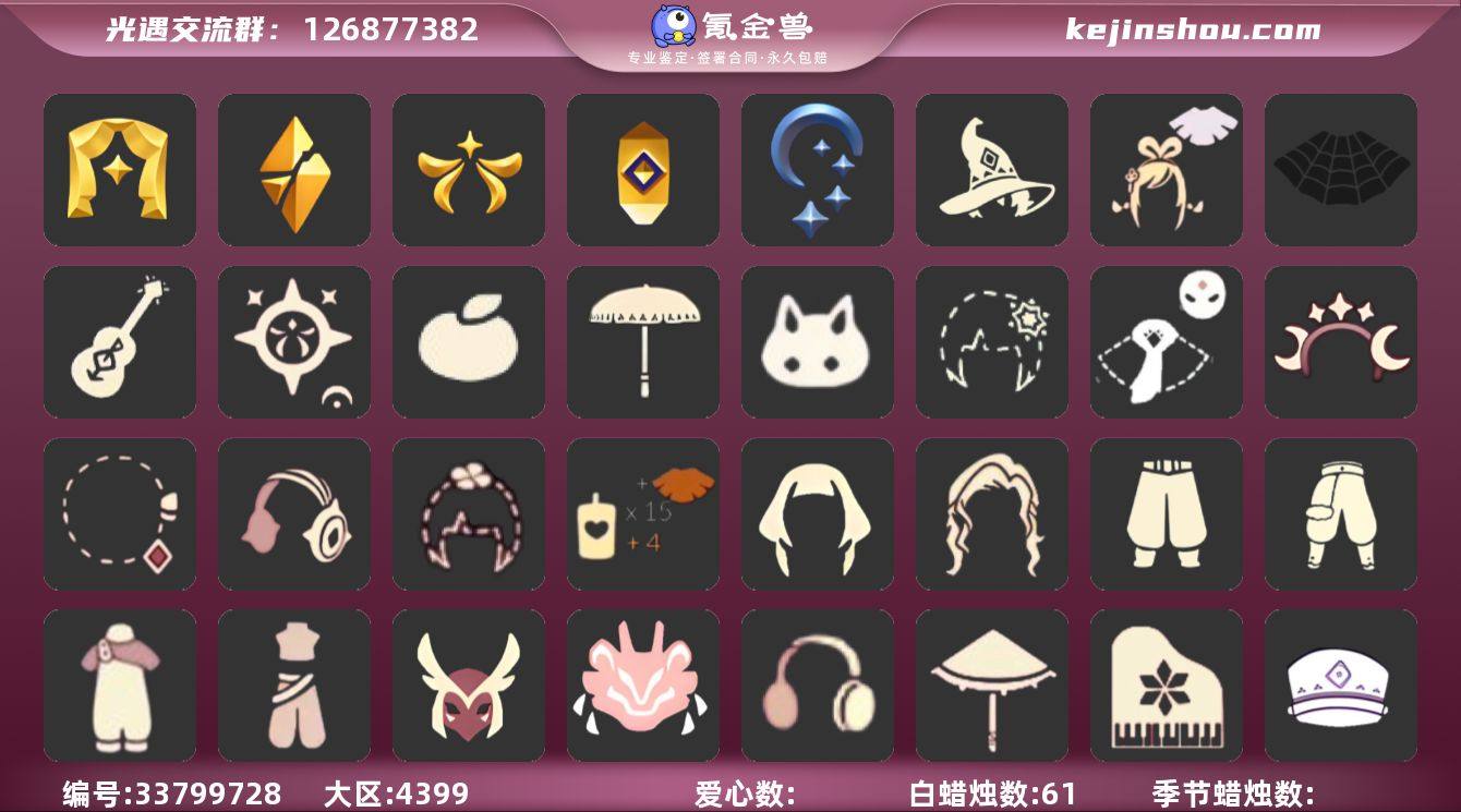 安卓官服 邮箱账号 2珍稀物品 5毕业季 3毕业图 61蜡烛 【珍稀物品】白枭(帝企鹅发),透明蝶翼斗 【季节已毕业】表演季,破晓季,欧若拉季(欧若拉),追忆季,夜行季 【完成地图】雨林,霞谷,墓土(暮土) 【礼包】巫师(巫师帽),绊爱(绊爱斗篷)(绊爱礼包),橘子(大橘大利),雪花(雪花发夹),兔子(玉兔头饰)(玉兔发饰)(兔子发饰),四叶草(四叶草头饰),星月头饰(星月头冠),彩虹耳钉(彩虹耳饰),彩虹耳机,创始人(创始人斗篷),蜘蛛斗(蛛丝斗篷)(蛛网斗篷),猫套(皮皮猫斗)(皮皮猫礼包),吉他(音韵吉他)(白吉他),人声乐器(欧若拉之声),黄伞(夏日阳伞) 【裤子】蓝绿裤(高领舞服),武士裤,背带裤,搓澡巾 【面具】黄眉企鹅面具,夜行毕业面具(棕熊面具) 【面饰】红耳机 【项链】围巾(肩带) 【发型】留辫蘑菇头,虚荣 【头饰】平顶帽,蓝色音乐会(蓝色音乐符) 【斗篷】冥龙斗篷,燕尾斗篷,遥鲲斗篷(双翼遥鲲斗),粉红绒毛斗篷(绒毛斗篷),绿芽,海洋斗 【配饰】鲲灯(追忆之书),雨伞,高音钢琴(白色高脚钢琴)