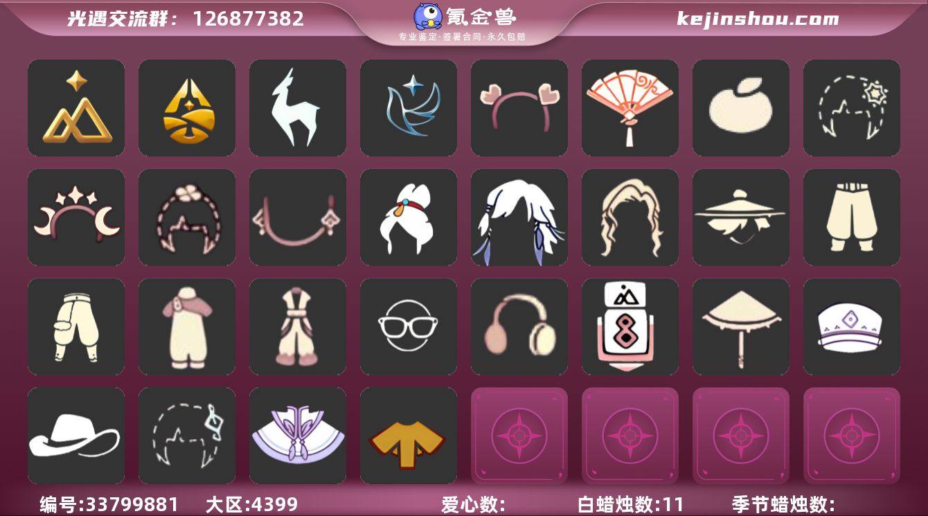 [19083207]安卓官服 邮箱账号 1珍稀物品 4毕业季 3毕业图 11蜡烛 【珍稀物品】彩虹围巾(五塑彩带斗) 【季节已毕业】拾光季,归巢季,九色鹿(九色鹿季),青鸟季 【完成地图】晨岛,雨林,霞谷 【礼包】橘子(大橘大利),雪花(雪花发夹),心心相印发饰礼包,四叶草(四叶草头饰),星月头饰(星月头冠),新年耳钉(金鳞耳饰),献瑞折扇礼包 【裤子】飞天裤(柔缎花边连)(九色鹿丝带裤),武士裤,背带裤,搓澡巾 【面饰】青鸟毕业面饰(青鸟面饰),黑框眼镜(粗框眼镜),红耳机 【发型】飞天盘发(九色鹿丸子头),虚荣,归巢毕业发型(五塑彩羽发),若笠(箬笠) 【头饰】平顶帽,蓝色音乐会(蓝色音乐符),牛仔帽(西部帽) 【斗篷】青鸟毕业斗篷(青鸟斗篷),绿芽,黄色蓑衣(道袍) 【配饰】相机(季卡相机),雨伞