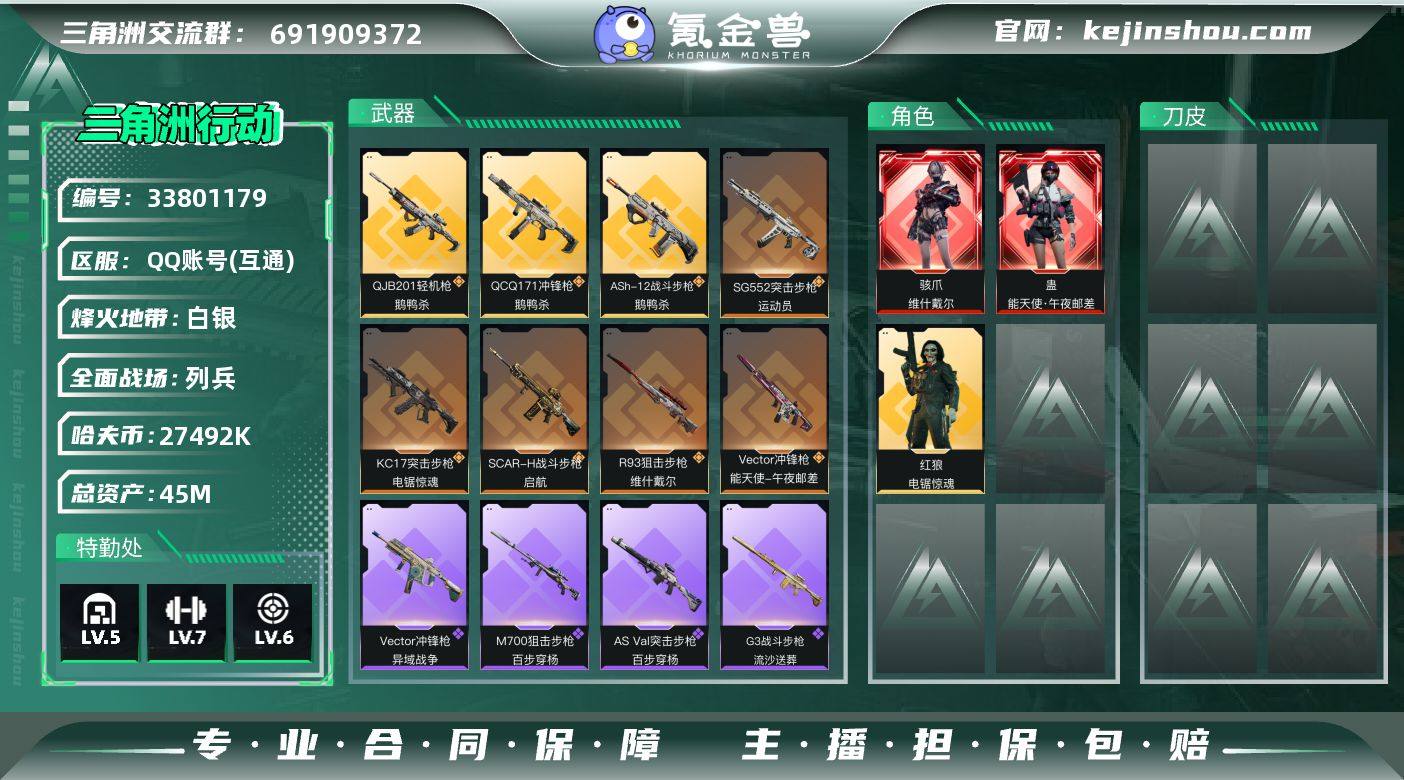 【SJZQH1919】总资产45M/哈夫币2749万/传说枪皮数8/战场等级11/行动等级60/安全箱等时效性道具以游戏内数据为准,详情请看图/蛊-能天使·午夜邮差/骇爪-维什戴尔/红狼-电锯惊魂/近战-黑鹰/ASh-12战斗步枪-鹅鸭杀/SG552突击步枪-运动员/SCAR-H战斗步枪-启航/KC17突击步枪-电锯惊魂/Vector冲锋枪-能天使-午夜邮差/QCQ171冲锋枪-鹅鸭杀/QJB201轻机枪-鹅鸭杀/R93狙击步枪-维什戴尔/G3战斗步枪-流沙送葬/AS Val突击步枪-百步穿杨/腾龙突击步枪-猎鳄行动/MP5冲锋枪-战术竞备/Vector冲锋枪-异域战争/SR-3M紧凑突击步枪-战术竞备/SV98狙击步枪-猎鳄行动/M700狙击步枪-百步穿杨/QCQ171冲锋枪-地平线/ASh-12战斗步枪-繁盛/M7战斗步枪-捣蛋鬼/SG552突击步枪-2026/SCAR-H战斗步枪-荣耀列队/G3战斗步枪-主宰/腾龙突击步枪-冰天雪地/K437突击步枪-生存指令/MK47突击步枪-精英联盟/MP5冲锋枪-哈夫克卫队/P90冲锋枪-黄昏/Vector冲锋枪-先锋/UZI冲锋枪-亚特兰蒂斯/SMG-45冲锋枪-行动开启/SMG-45冲锋枪-幻影结构/勇士冲锋枪-前沿科技/勇士冲锋枪-主宰/M1014霰弹枪-幻影结构/QJB201轻机枪-哈夫克卫队/AS Val突击步枪-猛兽/M7战斗步枪-噬菌体/M4A1突击步枪-粉色涂装/M4A1突击步枪-高雅黑/M4A1突击步...