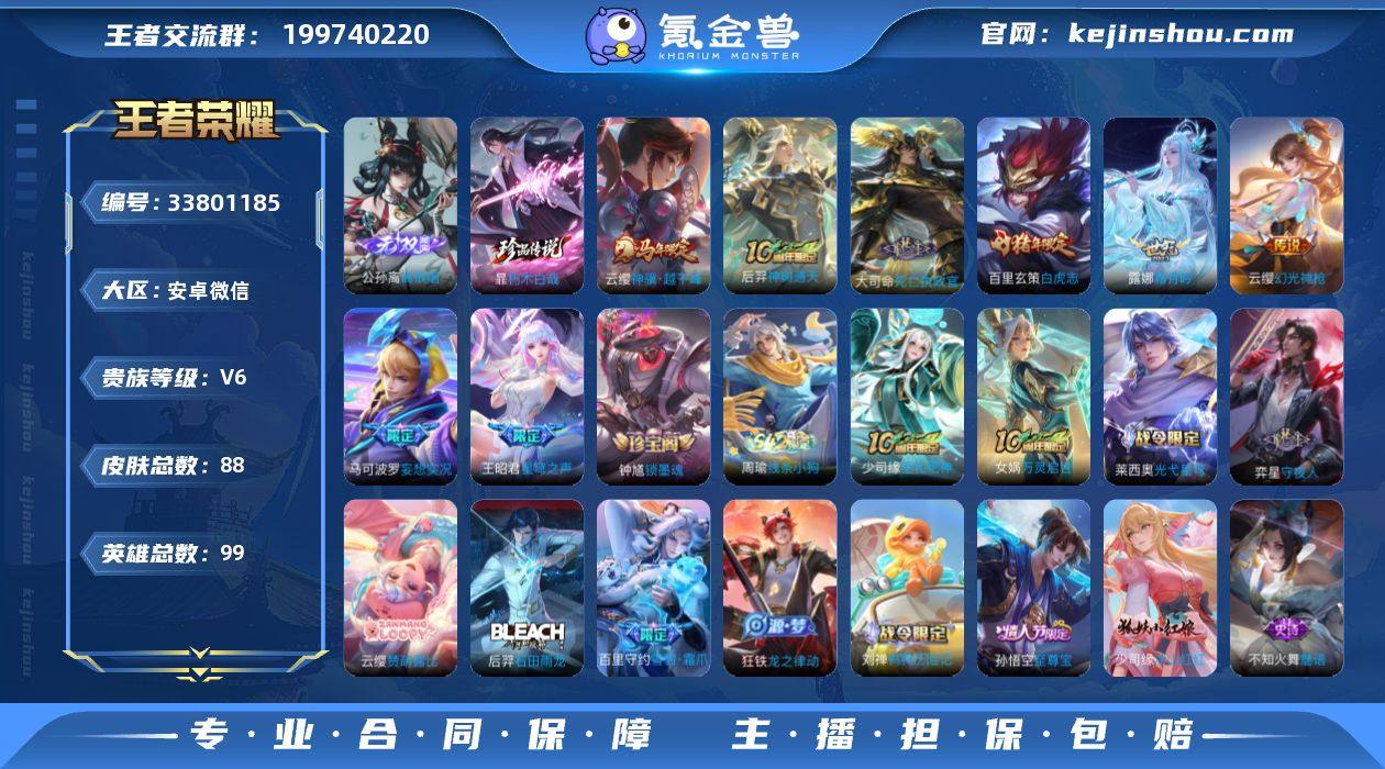 社交限制【高性价比·离恨烟·朽木白哉·白虎志·神骥越千峰·星穹之声·死亡执政官·霜月吟·妄想实况·可二次】YXw23498-安卓WX-99英雄-88皮肤-1王者印记-40铭文-贵族积分1w【贵族6】【·1无双·1珍品·8传说·6按键·214幸运值】【因赛季更新游戏段付以上号为准!】 【英雄全皮】:孙权全皮 【无双皮肤】:公孙离离恨烟 【珍品传说】:暃朽木白哉 【传说皮肤】:云缨神骥越千峰,后羿神树通天,大司命死亡执政官,云缨幻光神枪,露娜霜月吟,马可波罗妄想实况,王昭君星穹之声,百里玄策白虎志 【限定皮肤】:公孙离离恨烟,虞姬夏日便利店,姜子牙天穹之誓,杨戬破阵退雄兵,狄仁杰阴阳师,赵云皇家上将,马可波罗妄想实况,狄仁杰魔术师,项羽海滩派对,王昭君星穹之声,孙悟空至尊宝,雅典娜单词大作战,百里玄策白虎志,周瑜熔金海岸 【年限皮肤】:百里玄策白虎志 【赛季限定】:姜子牙天穹之誓,太乙真人谧流熔炉,钟馗虚灵犬护,亚瑟荣光之誓 【战令限定】:雅典娜单词大作战,虞姬夏日便利店,亚连破空之剑,孙悟空神迹守卫,刘禅鸭鸭历险记,沈梦溪鸭鸭历险记,莱西奥光弋星穹,明世隐往忆晖光,周瑜线条小狗 【史诗皮肤】:钟馗锁墨魂,周瑜线条小狗,少司缘巫礼祀神,女娲万灵...