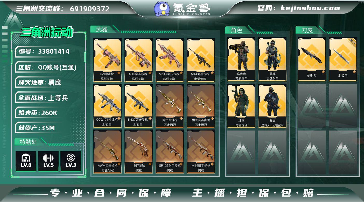 【sjs10521】【⭐ 可二次 1刀皮 卖号能回血 精品单刀号】 sjs10521 35m总资产-260k哈夫币-60烽火等级-黑鹰-40战场等级-上等兵 【干员外观】:蜂医-送葬人·无题密令,红狼-电锯惊魂,露娜-金牌射手,乌鲁鲁-荒原猎手 【近战皮肤】:近战-北极星,近战-处刑者1级,近战-黑鹰 【传说外观】:M4A1突击步枪-阿米娅,AKM突击步枪-锦绣,AUG突击步枪-悠然茶歇,SG552突击步枪-运动员,AK-12突击步枪-特斯拉线圈,SCAR-H战斗步枪-启航,CAR-15突击步枪-阿米娅,腾龙突击步枪-捞点薯条,腾龙突击步枪-万金泪冠,K437突击步枪-北极星,K437突击步枪-锦绣,KC17突击步枪-电锯惊魂,MK47突击步枪-悠然茶歇,UZI冲锋枪-特斯拉线圈,UZI冲锋枪-悠然茶歇,SMG-45冲锋枪-骑士,SMG-45冲锋枪-锦绣,SR-3M紧凑突击步枪-特斯拉线圈,勇士冲锋枪-能天使-午夜邮差,勇士冲锋枪-万金泪冠,QCQ171冲锋枪-北极星,725双管霰弹枪-送葬人-无题密令,M250通用机枪-骑士之心,M14射手步枪-电锯惊魂,M14射手步枪-蛮荒,M14射手步枪-缄花,SKS射手步枪-骑士,SR-25射手步枪-水墨云图,SR-25射手步枪-缄花,AWM狙击步枪-捞点薯条,AWM狙击步枪-万金泪冠,.357左轮-缄花,93R-捞点薯条,复合弓-黑·天际线 【...