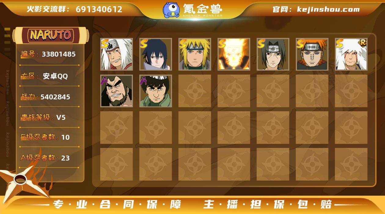 安卓QQ-S忍者数:10-购买了忍法帖-500多万战力- A忍者数:23 【S级忍者】自来也「传说中的三忍」(3星),宇智波斑「秽土转生·解」(3星),宇智波佐助「永恒万花筒」(3星),漩涡鸣人「九喇嘛连结」(3星),自来也「舞之豪杰」(3星),宇智波带土「十尾人柱力」(3星),宇智波鼬「须佐能乎」(3星),漩涡鸣人·宇智波佐助(3星),佩恩「天道」(3星),波风水门(3星), 【A级忍者】宇智波佐助「须佐能乎」(2星),迪达拉「秽土转生」(2星),千代「近松十人卫」(2星),宇智波泉奈(2星),神农「羁绊」(2星),猿飞日斩「火影继承人」(2星),干柿鬼鲛(2星),迈特凯(2星),蝎(2星),我爱罗「疾风传」(2星),飞段(2星),飞段「死司凭血」(2星),波风水门「青年」(2星),长十郎「六代目水影」(2星),长门「青年」(2星),神秘面具男「忍者之路」(2星),旗木卡卡西「神威对决」(2星),小南「神驹佑将」(2星),漩涡博人「桃式显现」(2星),迈特凯「青春爆炸」(2星),巳月「仙人模式」(2星),大野木「侠隐江湖」(2星),机械鸣人「初始形态」(2星),