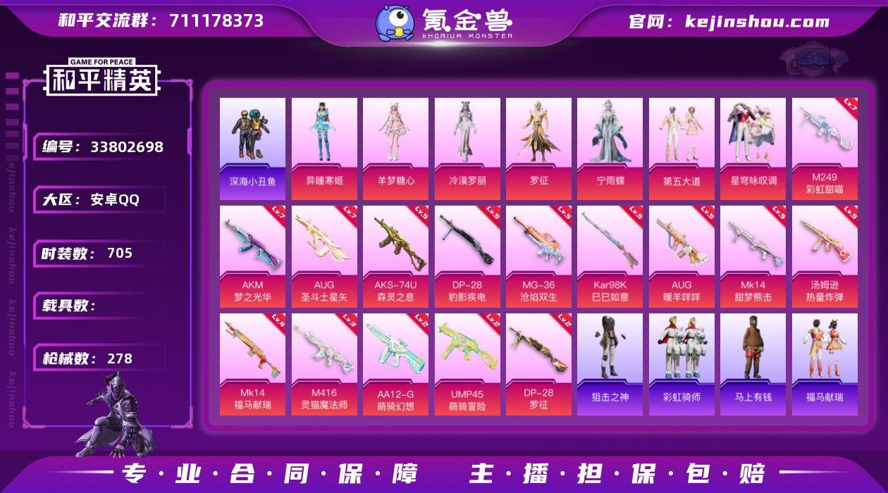 因本人要工作没时间玩,和平精英安卓QQ区成品号,皮肤多,时装枪皮动作都有,账号干净安全,支持加好友赠送,正常用没问题,自己注册的