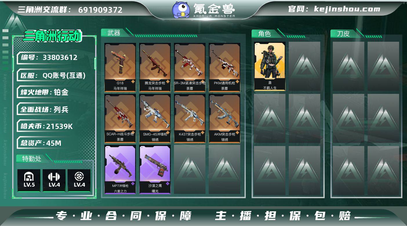 【sjs11207】【包人脸】【小额资产号】44m+21m纯币 sjs11207 45m总资产-21539k哈夫币-43烽火等级-铂金-8战场等级-列兵 【干员外观】:蛊-不羁人生 【近战皮肤】:近战-黑鹰 【传说外观】:AKM突击步枪-锦绣,SCAR-H战斗步枪-荼蘼,腾龙突击步枪-马年祥瑞,K437突击步枪-锦绣,SMG-45冲锋枪-锦绣,SR-3M紧凑突击步枪-荼蘼,PKM通用机枪-荼蘼,G18-马年祥瑞 【史诗外观】:MP7冲锋枪-六套之力,QJB201轻机枪-炽焰,沙漠之鹰-曙光 【稀有外观】:SG552突击步枪-贴花艺术, AK-12突击步枪-马年新春,SCAR-H战斗步枪-荣耀列队,K437突击步枪-生存指令,MK47突击步枪-精英联盟,Vector冲锋枪-先锋,勇士冲锋枪-冰天雪地,QJB201轻机枪-哈夫克卫队,Mini-14射手步枪-荣耀列队,SKS射手步枪-弄臣 【普通外观】:QBZ95-1突击步枪-海浪,QBZ95-1突击步枪-海色,AUG突击步枪-浅蓝涂装,M7战斗步枪-红色涂装,M7战斗步枪-黑巧甜心,SG552突击步枪-狂欢,P90冲锋枪-黑巧甜心,UZI冲锋枪-狂欢,野牛冲锋枪-高雅黑,M1014霰弹枪-高雅黑,M1014霰弹枪-海浪,M1014霰弹枪-重击,杠杆式步枪-出货,M249轻机枪-黄蜂,QJB201轻机枪-典雅,SVD狙击步枪-高雅黑,SR-25射手步枪-黄蜂,SR9射手步枪-出...