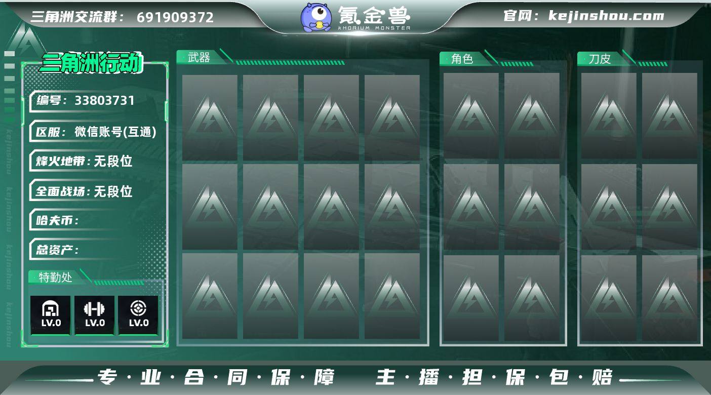 实名: 不可修改 总资产: 146.5 哈夫币: 62 传说武器皮肤: M4A1突击步枪-蚀金玫瑰,M7战斗步枪-维京,M7战斗步枪-神秘艺术,SCAR-H战斗步枪-铁艺苍穹,近战-影锋,SR-25射手步枪-水墨云图,SCAR-H战斗步枪-水墨云图,AS Val突击步枪-蛇年祥瑞,QJB201轻机枪-黑海,MP5冲锋枪-黑海,近战-黑海,AK-12突击步枪-夜鹰,SMG45冲锋枪-骑士,G18-飞虎,AKM突击步枪-流光铂影,725双管霰弹枪-送葬人-无题密令,复合弓-黑-天际线 干员外观: 红狼-蚀金玫瑰,牧羊人-街头之王(S2),威龙-壮志凌云(S3),骇爪-水墨云图,蜂医-黑鹰坠落,无名-夜鹰(S4),威龙-飞虎